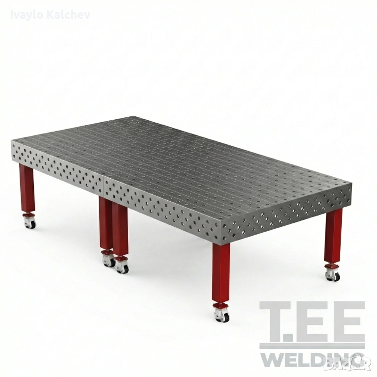 Заваръчната маса е изработена от масивна стоманена плоча с дебелина 15 мм, подсилена с ребра за максимална устойчивост и минимални деформации при натоварване.