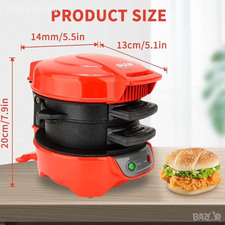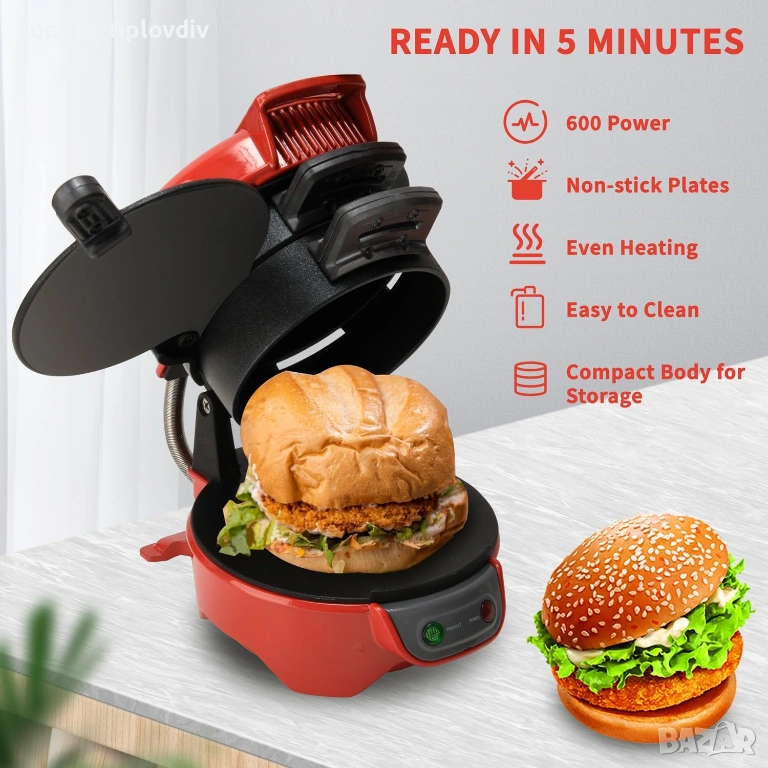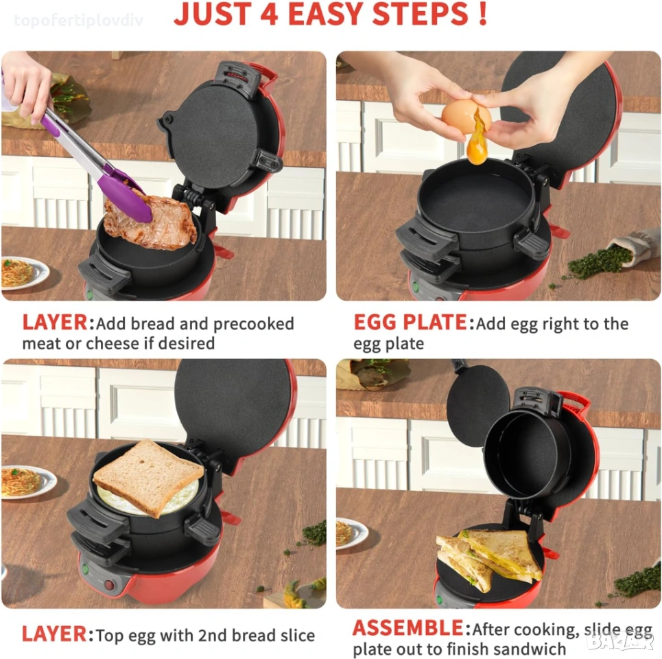 Бързо и лесно: Позволява ви да приготвите богат сандвич/бургер само за няколко минути. Използвайте свои собствени пресни съставки, включително яйца, сирене и други, и пригответе вкусни сандвичи за закуска в уюта на собствения си дом. Позволява ви да се насладите на 5-минутна закуска, спестявайки време и енергия.