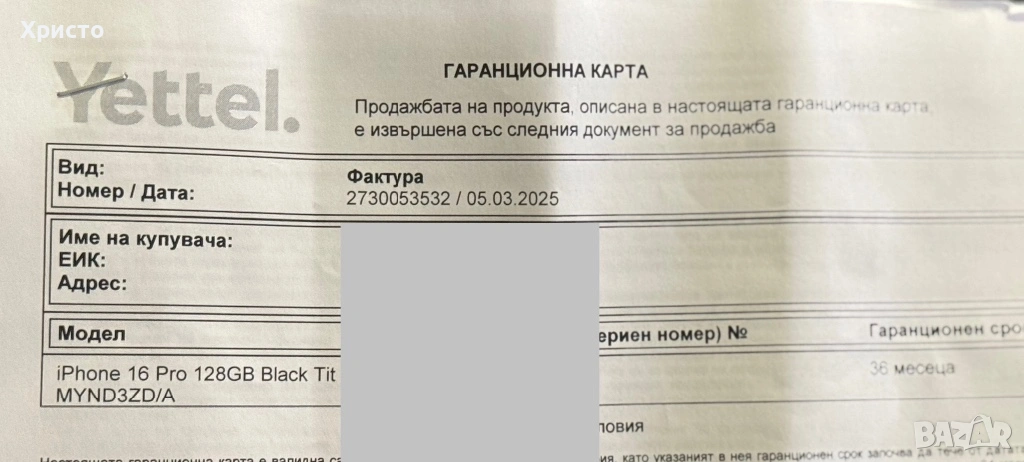 Закупен е на 5 Март 2025 година с 36 месеца гаранция, което означава, че има валидна гаранция до Май 2028 година. Работи със всички оператори и няма никакъв риск от заключване.