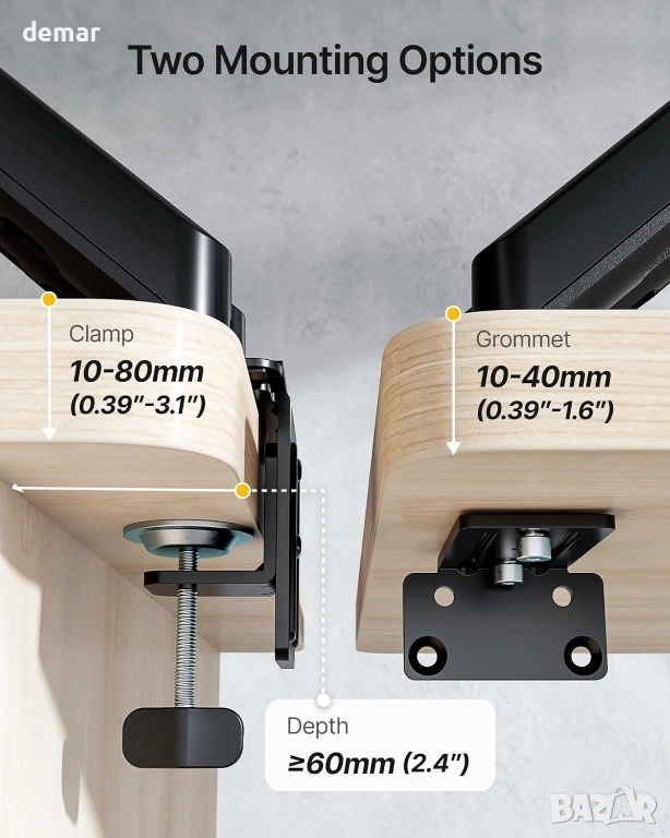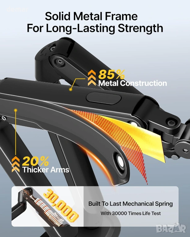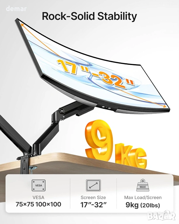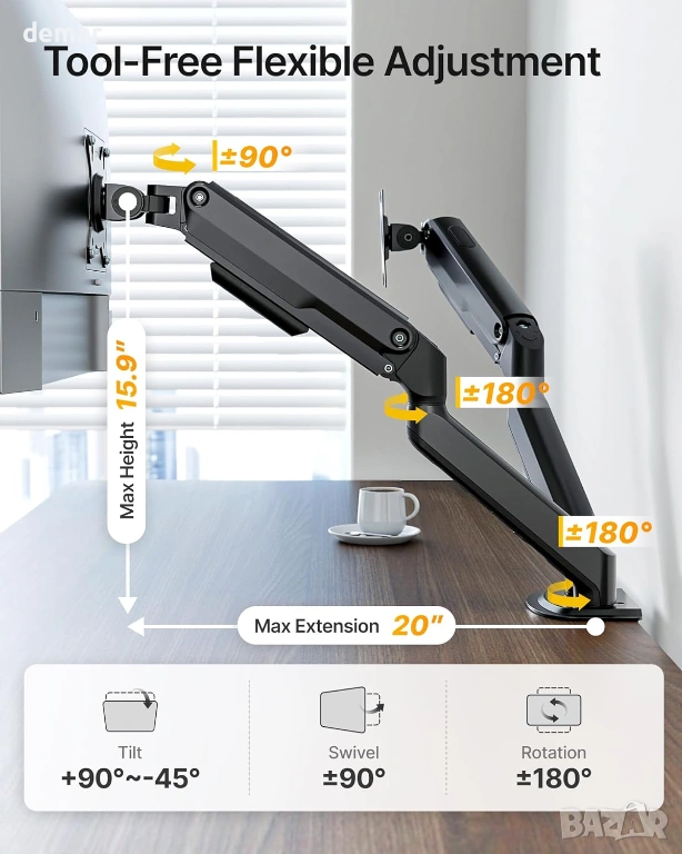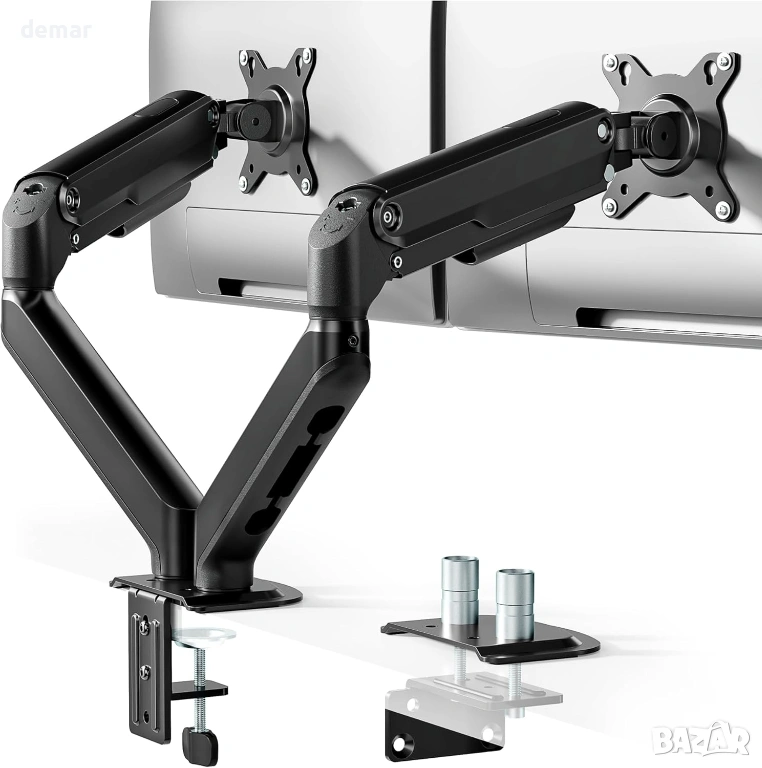 Здрава стоманена стойка за два монитора, проектирана да поддържа два екрана с диагонал 17–32 инча с тегло до 9 кг на рамо, осигурявайки стабилна и безклатеща се работа. Двойните механични пружинни рамена осигуряват плавно и прецизно регулиране на височината и ъгъла с постоянна и надеждна опора. Предлага пълна гъвкавост на движение, включително накланяне от +90° до -45°, завъртане на ±90° и въртене на 360°, което позволява независимо позициониране за подобрена ергономичност и намалено напрежение. Повдига мониторите, за да освободи до 30% повече място на бюрото, докато интегрираното управление на кабелите поддържа чисто и организирано работно място. Инсталира се лесно с помощта на C-образни скоби или втулки и поддържа VESA 75 × 75 мм и 100 × 100 мм шаблони, което я прави подходяща за домашни, геймърски или професионални конфигурации с два екрана.
