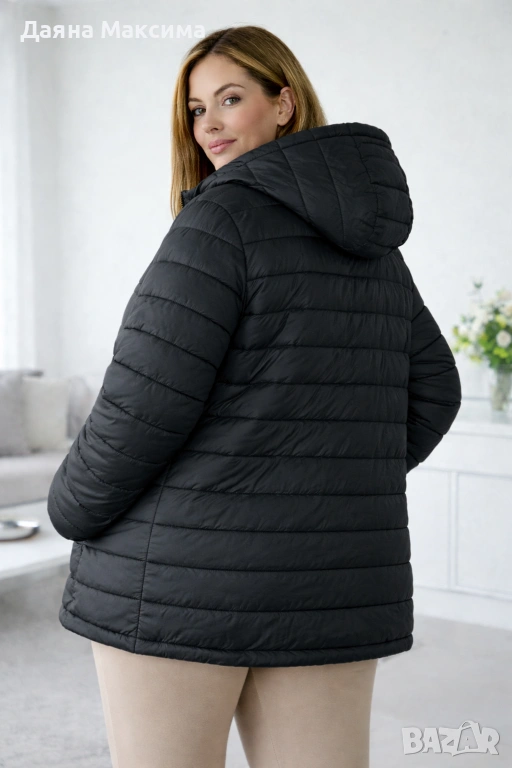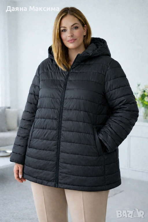 Черно и бежово ватирано преходно яке с пълнеж силиконов пух (средно дебело-пролетно), размери по етикет EU 52, 56 и 58, капитонирано, олекотено, джобове отпред, качулка