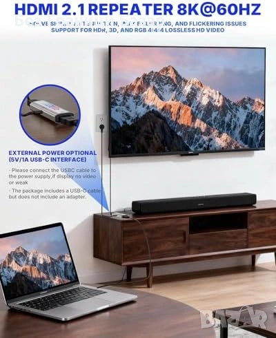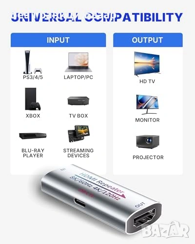 Нов HDMI сигнален усилвател удължител до 50м 1080p HDCP 2.3 PS5 USB-C