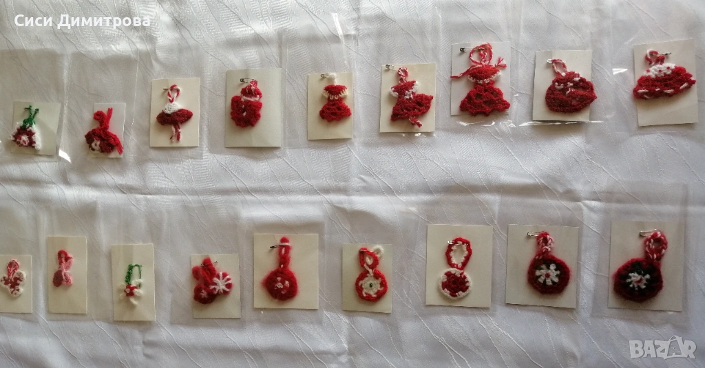 Ръчно изплетени брошки под формата на розички, цветенца, медальони, роклички, тип мартеници, с безопасна игла за закачане върху дрехи, блузи, ревери на сако, чанти и т. н. Опаковани в прозрачен плик, върху картон с малка безопасна игла. Цена - 1 евро/брой. Минимална стойност на поръчка- 5 евро.