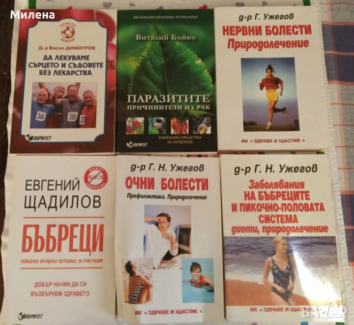 книги на руски с твърди корици:"Русская кухня",цена 25Евро,"Носители уникального дара",цена 1,50Евро,"Вольф Мессинг-драма жизни великого хипнотизера",цена 1,50Евро,"Ванга-тайна дара болгарской Кассандры",цена 1,50Евр от. "Time for fun" от R.Todorova и E.Staneva,на английски език,цена 6 Евро. Обикновен английски тълковен речник на английски език:"Simple English dictionary",цена 10Евро. Продавам двете книги на д-р Лиса Ранкин:"Победа на ума над медицината",цена 10 Евро и "Изцеление от страха",цена 10 Евро. Книги на Олга Елисеева: "Класическо прочистване на организма всеки ден",цена 15 Евро; "Тайната на неправилните диагнози",цена 7,50 Евро. "Моят опит в лечението на рака",цена 7,50 Евро. Книга на д-р Ф.Батманжелидж:"Вы не болны,у Вас жажда"-Продадена Книга на Лоранс Перну:"Аз възпитавам детето",цена 15 Евро. "Победете дисбактериозата",автор Ксения Николаева,цена 4,50 Евро. Книги на Гейбриел Казънс:"Съзнателно хранене"-1част и 2 част,цена общо 25 Евро. "Библия на витамините за 21 век",автор Ърл Миндъл,цена 15 Евро. "Хранителните добавки-истините и митовете",автор Йонко и Христо Мермерски,цена 15 Евро. Книги на Г.Н.Ужегов:"Очни болести",цена 4,50 Евро. "Заболявания на бъбреците и пикочно-половата система",цена 17 Евро. "Нервни болести",цена 15 Евро. "Бъбреци",автор Евгений Щадилов,цена 12 Евро. "Да лекуваме сърцето и съдовете без лекарства",д-р Васил Димитров-Продадена