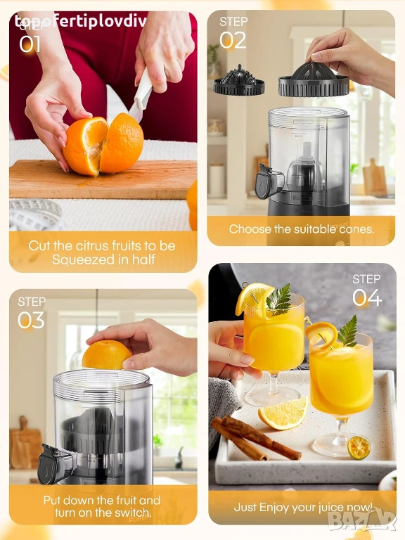 Професионална сокоизстисквачка за цитруси с два смилащи конуса: Нашата електрическа сокоизстисквачка за портокали може да се използва не само за цитрусови плодове като портокали, лимони и грейпфрути, но и за нецитрусови плодове като грозде, нарове, ябълки, ананаси и други. Наслаждавайте се на пресен плодов сок без семки всеки път!