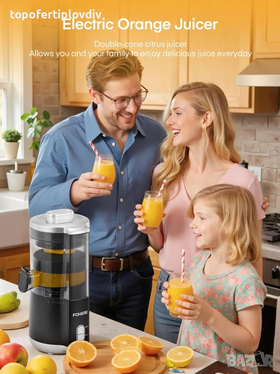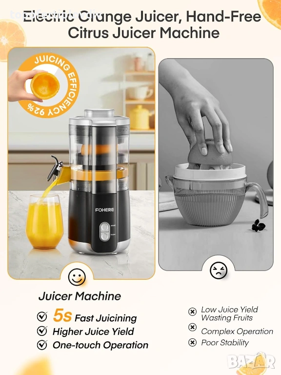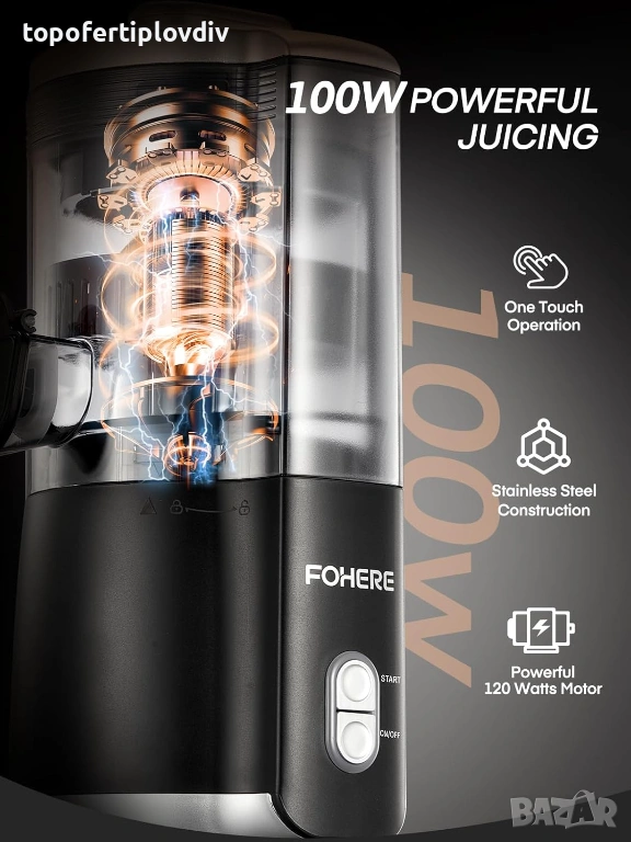 Сокоизтисквачката FOHERE за цитруси се отличава както с високо качество, така и с естетическа привлекателност. Нейният 100-ватов мотор произвежда чаша сок само за 40 секунди, работейки тихо и без разклащане или преобръщане. За разлика от други сокоизстисквачки, просто натискате бутона "Старт" и машината започва да изцежда, освобождавайки ръцете ви.