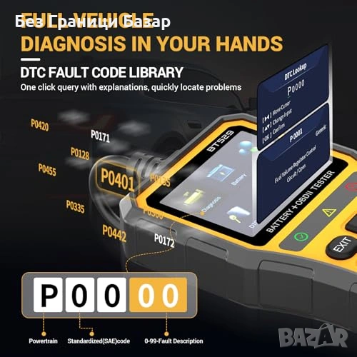 BLE + мобилно приложение: работа директно на уреда или през телефон; live data, freeze frame и справка на кодове