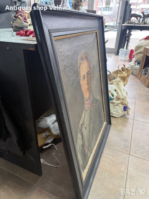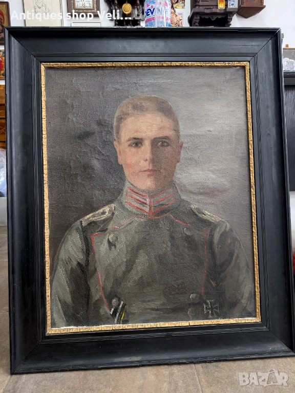 Стара немска картина портрет ма войник. Имала е забележки, но е реставрирана. Предлагаме доставка с Еконт и лично предаване за градовете Велико Търново, Русе и Сливен!
