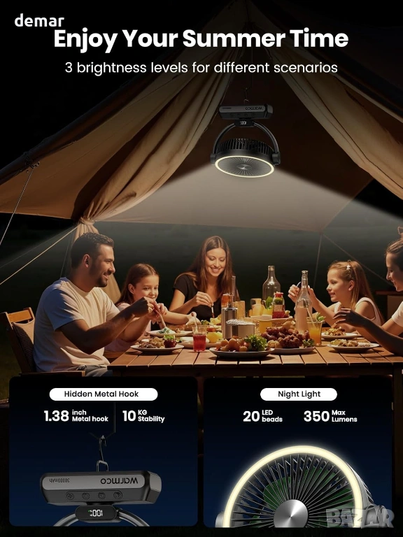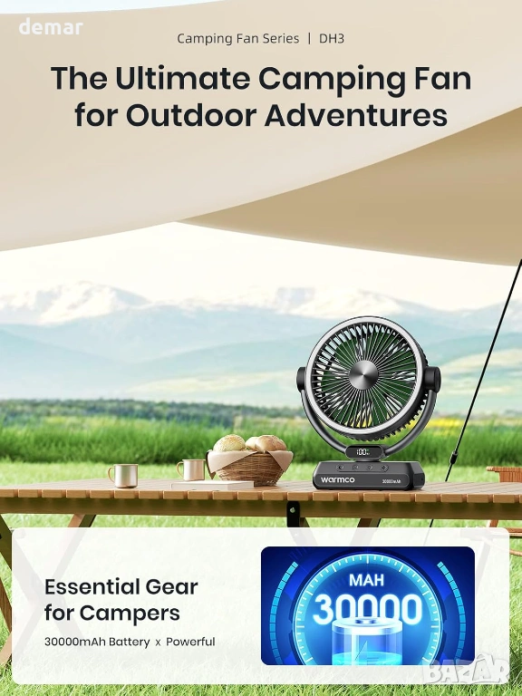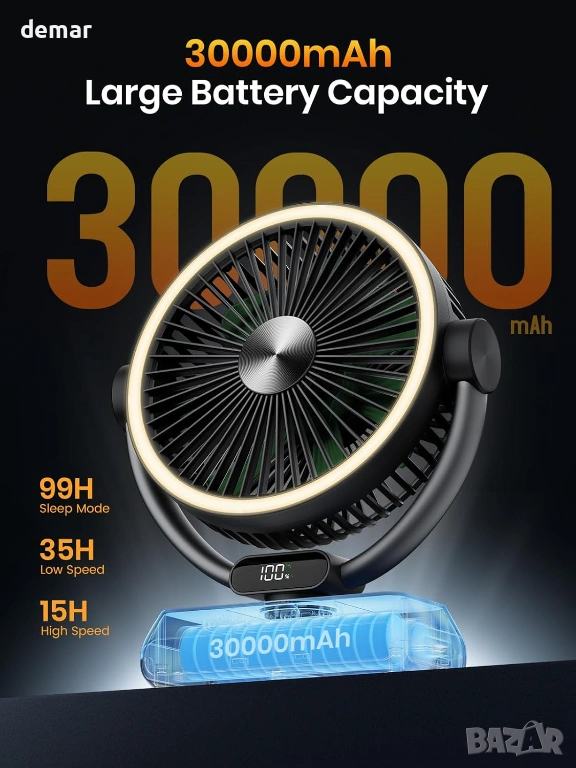 Преносимият вентилатор Warmco DH3 се захранва от батерия с висок капацитет 30000mAh, осигуряваща удължено време на работа за употреба на открито или при спешни случаи, докато 30W PD USB-C входът и изходът позволяват бързо презареждане и му позволяват да функционира като външна батерия за телефони или таблети. Той разполага със специален режим на заспиване, осигуряващ ултра-дълга работа с лек бриз, плюс регулируем таймер за автоматично изключване (1H/2H/4H/8H) за енергоспестяваща употреба през нощта. Проектиран с безчетков мотор и аеродинамични перки, той работи с ниско ниво на шум, подходящо за спане, работа или къмпинг. Вграденият тристепенен LED фенер добавя практично осветление, допълнено от здрава метална кука за сигурно окачване в палатки или каравани. Подвижният преден капак осигурява лесно почистване и помага за поддържане на постоянен въздушен поток във времето.