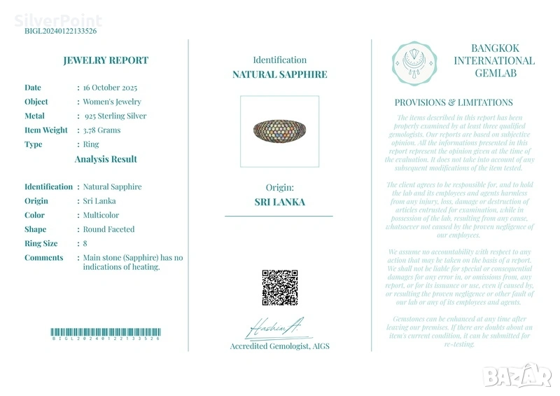 Сребърен пръстен с цветни Сапфири от Шри Ланка и сертификат