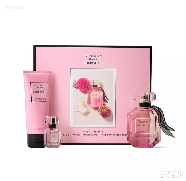 Made in USA. Victoria’s Secret Bombshell- комплект с аромат на божури, искряща лилава маракуя и кремообразна ванилова орхидея. Включва парфюмна вода в пълен и малък размер, както и фин ароматен лосион.