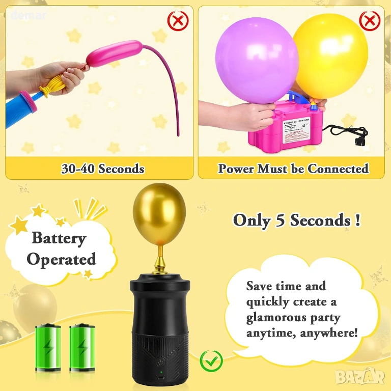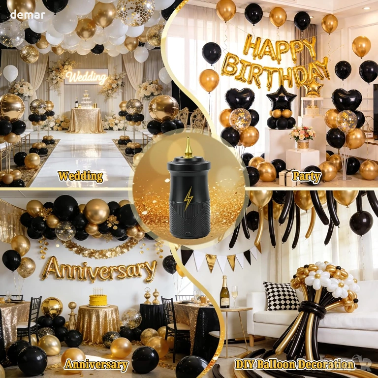 Безжична електрическа помпа за балони с компактен черно-златист дизайн, с акумулаторна батерия 2000mAh и зареждане Type-C за преносима употреба навсякъде. Включва дълги и къси накрайници, подходящи за различни видове балони, плюс вакуумен пръстен за съхранение и компресионни торбички, което я прави подходяща както за парти декорация, така и за съхранение у дома. Надува малки балони за секунди, а по-големите - бързо, значително намалявайки времето за подготовка в сравнение с ръчните помпи. Проектирана с неплъзгаща се дръжка, противоплъзгаща се основа за стабилност, интелигентен индикатор за захранване и автоматично изключване след 30 минути за безопасност и защита на батерията. Лесното управление с две предавки позволява ръчно натискане за напомпване или режим на непрекъснато напомпване, осигурявайки лесна употреба за начинаещи и ефективна работа за големи събития.