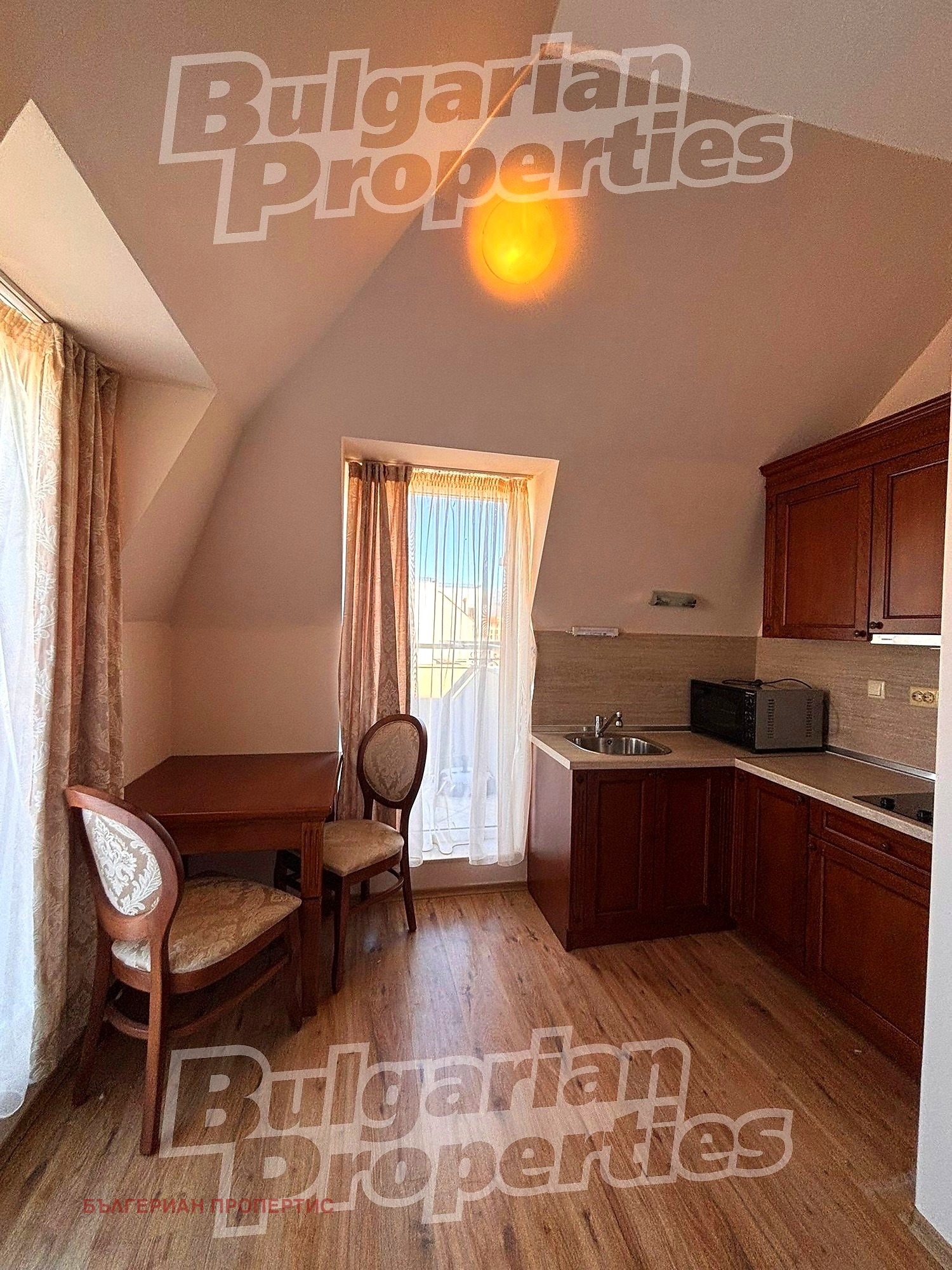 Предлагаме за продажба напълно обзаведено и оборудвано студио с панорамна тераса в луксозния комплекс Даун Парк Делукс. Имотът е готов за ползване или отдаване под наем, с удобства, подходящи за целогодишно живеене. Комплексът е разположен в тихата част на Слънчев бряг, на 10 минути пеша от центъра на курорта и плажа.