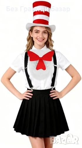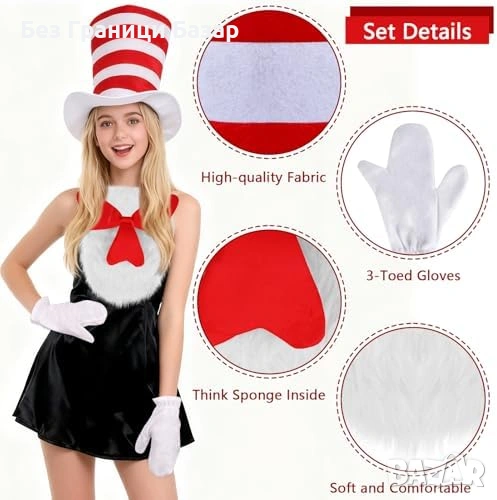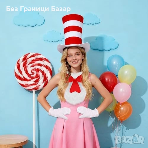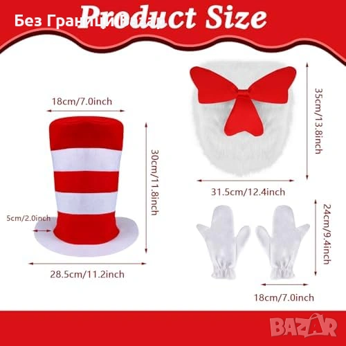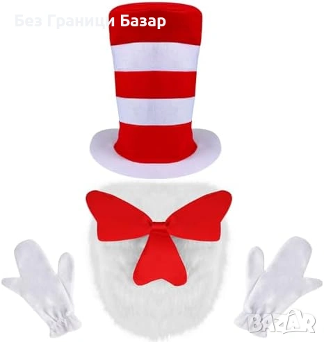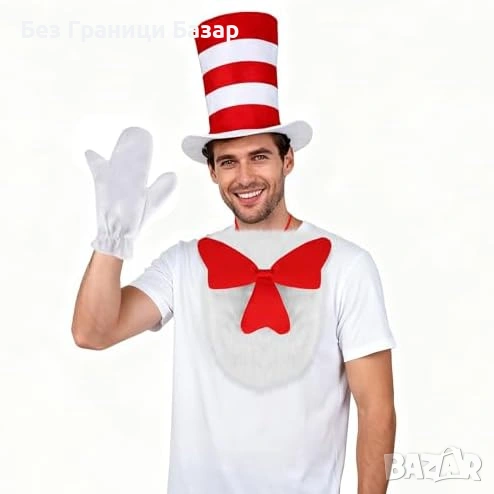 Включва: висока цилиндър-шапка (червено/бяло райе), голяма пухкава червена папионка с бял пух, бели ръкавици с 3 „пръста“