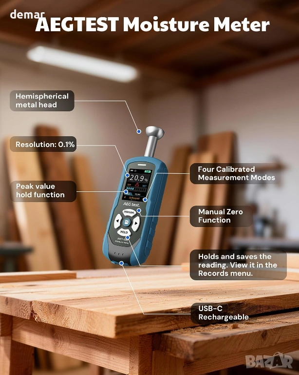 Безщифтов влагомер с полусферична сензорна глава и увеличена контактна площ за бързо, точно и неразрушително откриване на излишна влага в дърво, гипсокартон и други строителни материали, идеален за идентифициране на течове, наводнения и влажни зони в мазета, бани и кухни. Разполага с вградена USB-C акумулаторна батерия за многократна употреба и пълноцветен дисплей, показващ нивата на влажност, състоянието на батерията и алармени индикатори за ясна видимост при всякаква светлина. Включва функции за задържане и съхранение на данни с интегрирана референтна таблица за влажност, която помага за оценка на условията на сушене и проследяване на проблемните зони. Предлага регулируеми визуални и звукови аларми с опция за изключване на звука за гъвкави инспекции. Доставя се с USB-C кабел, ръководство за потребителя и преносим платнеен калъф.
