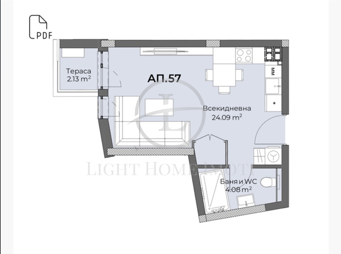 - Разпределение: Просторен и светъл хол с кухненски кът и спалня в едно, баня с тоалетна, килер и тераса.