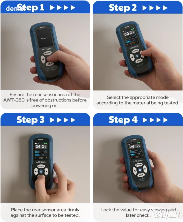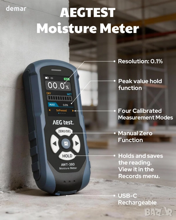 AWT-380 Акумулаторен безщифтов влагомер за дърво, гипсокартон и зидария