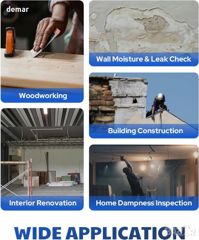 Безщифтовият влагомер осигурява бързо, неразрушително откриване с отчитания за една секунда и сканиране до 20 мм дълбочина, което го прави подходящ за проверка на стени, подове, мебели, гипсокартон, дърво и локализиране на потенциални течове на вода, без да оставя следи. Той разполага с вградена USB Type-C акумулаторна батерия за удобна и рентабилна ежедневна употреба, както и с ясен цветен дисплей, който показва нивата на влажност, състоянието на батерията и алармени индикатори при различни условия на осветление. Функциите за максимално задържане и съхранение на данни помагат за проследяване на влажни зони и идентифициране на проблемни места, докато регулируемите визуални и звукови аларми се активират при превишаване на предварително зададените прагове на влажност, с опция за заглушаване на звуковите аларми. Комплектът включва измервателния уред, USB-C кабел за зареждане, ръководство за потребителя и преносим платнеен калъф.