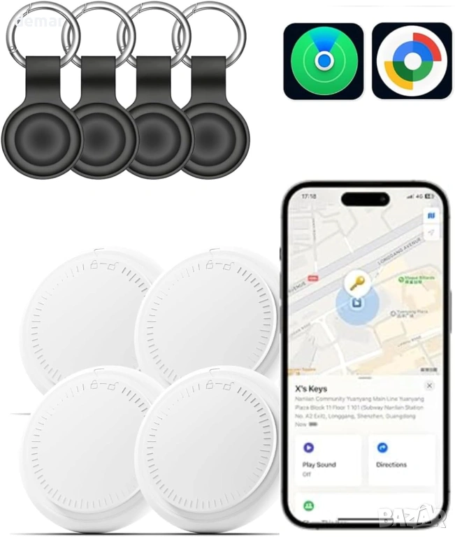 Комплект от 4 двусистемни тракера за iOS и Android за ключове, багаж, портфейл, превозни средства