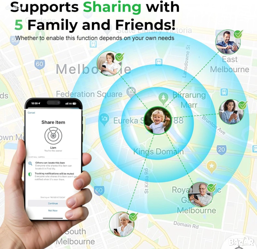 Този тракер е съвместим както с iOS, така и с Android устройства, като се свързва безпроблемно с мрежата Find My на Apple или приложението Find My Device на Google (една платформа наведнъж) без никакви абонаментни такси. Поддържа споделяне на устройства чрез iOS 17 или най-новите функции на Android, което позволява на доверени потребители да виждат актуализации на местоположението в реално време. Създаден с подход, ориентиран към поверителността, той използва криптирани, анонимни мрежи и не съхранява история на местоположенията или лични данни. Интелигентната система за предупреждение предлага проследяване на близко разстояние до 36 метра чрез Bluetooth и разполага с мощен вграден високоговорител от 80–100 dB, който помага за бързото локализиране на изгубени предмети. Незабавното сдвояване осигурява бърза настройка, като автоматично открива системата на вашето устройство за плавен и ефикасен процес на свързване.