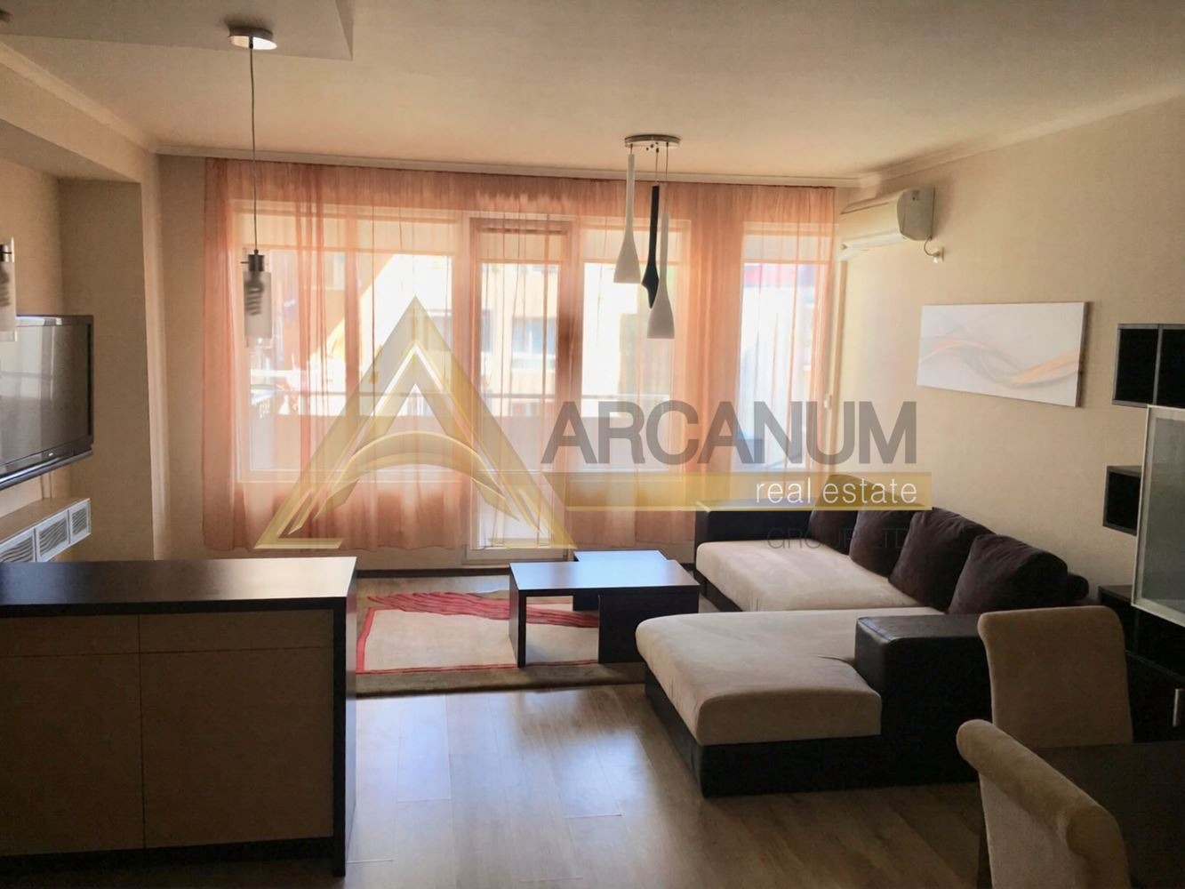 Отоплението и охлаждането в дневната е с климатик, а спалните са оборудвани с радиатори Адакс. Имотът се предлага напълно обзаведен и оборудван, включително с голяма съдомиялна машина.