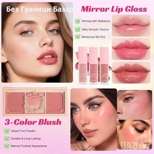 Съдържа: сенки, течен фон дьо тен, контур стик, руж палитра, гланц, очна линия, спирала, молив за вежди