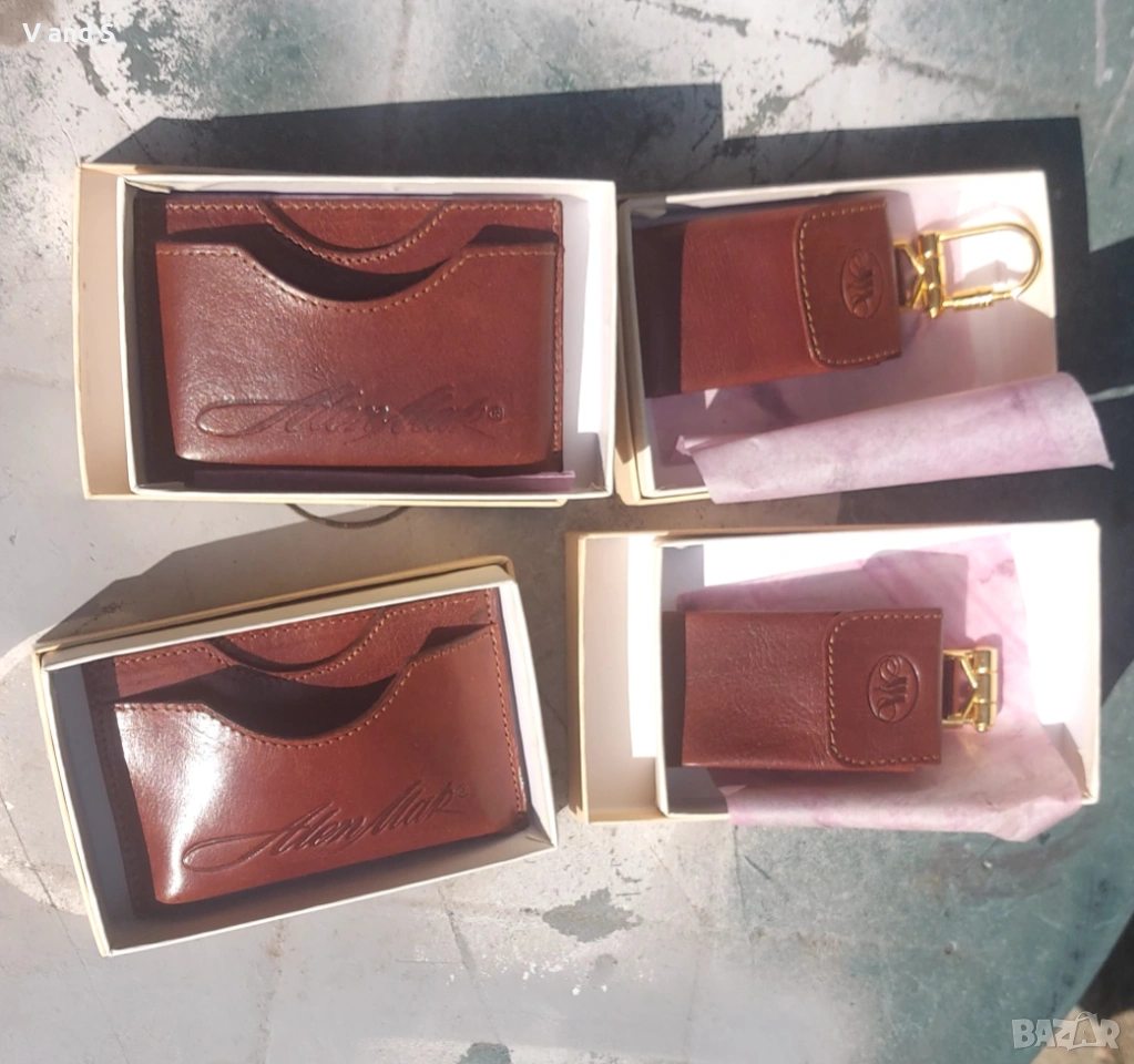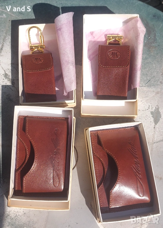 Нови ,в оригиналните си опаковки,стояли дълги години в шкафа,мисля че са внесени от Русия,естествена кожа. Цена за всички 15 евро,цена за комплект визитник и за запалка 10 евро