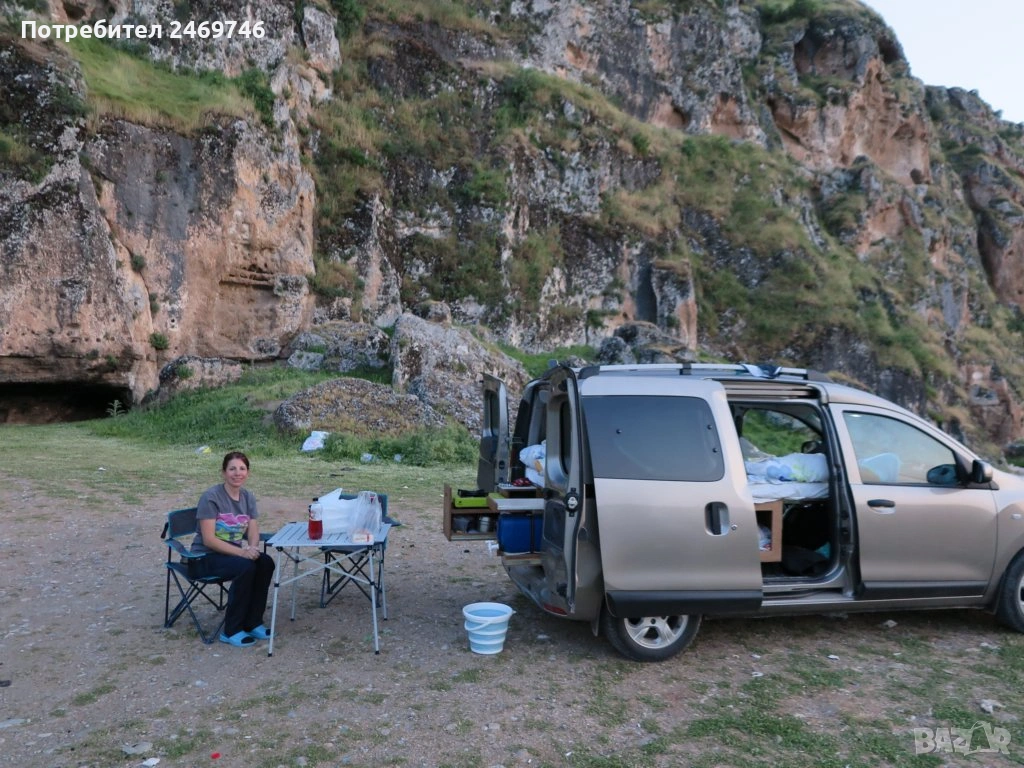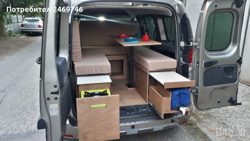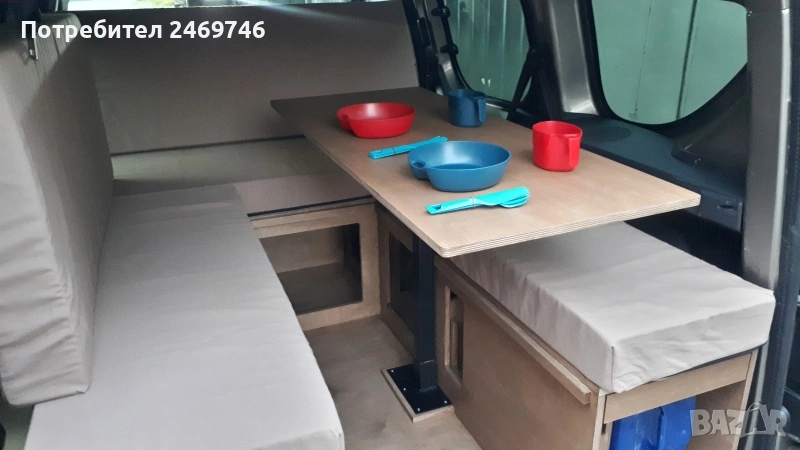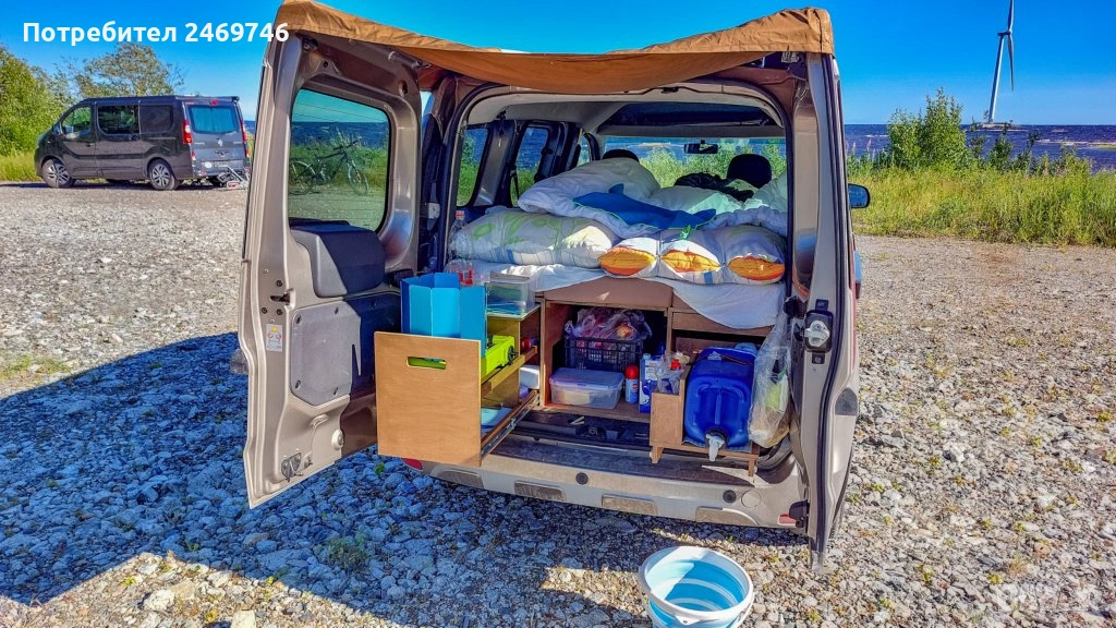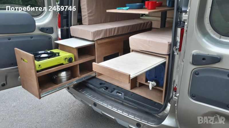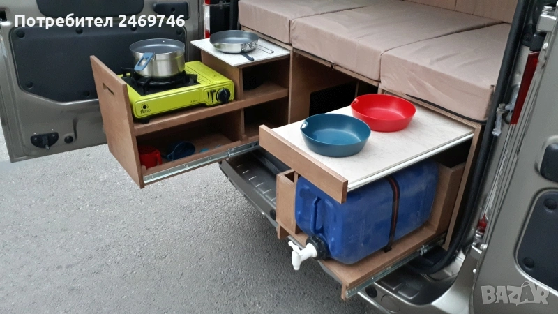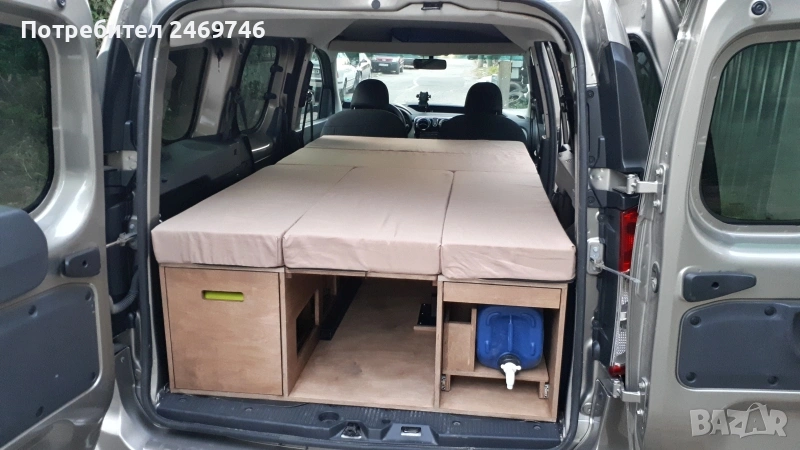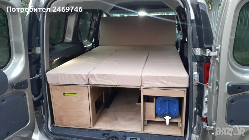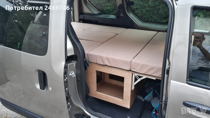 Продавам оборудване за преустройство на Dacia Dokker пътническият вариан в миниКемпър. За монтажа на оборудването е нужно да се премахне задната седалка, която е се държи на 2 болта. Оборудването е правено от професионални мебелисти по моя поръчка и мой модел. Разполага с 5 големи отвора за багаж под горната част и един по-голям отвор в средата. В задната част има чекмеджета, като едното е туба с вода и отвори за поставяне на различни неща, като препарати за съдове, хартия и т.н. Над него има плот за поставяне на посуда. От другата страна е кухнята, има газов котлон, отвори за посуда и отново малък рафт за поставяне на различни неща. Има крак, на който може да се поставя като маса средната плоскост на кревата. От към седалките има механизми, на които се подпира дъската при приготвяне на леглото. Леглото е с размери 120х200 см. Има специално приготвени планки за закрепване на мястото на задната седалка, по този начин конструкцията е сигурна и не се движи в различни посоки. Кревата е формиран от 5 възглавници от дунапрен с калъфи от ципове за да могат да се перат. Дунапрена съм го подбирал с подходяща твърдост и спането е много комфортно. Механизмите на чекмеджетата са висококачествени издържат 120 кг. Самите чекмеджета се застопоряват сигурно и не се движат по време на движение. Кемпър оборудването е подходящо и за други модели коли тип "баничарка", но трябва да се пробва дали ще влезе. Посудата, масата и столовете от снимките не са включени в цената, илюстративни са как се използва в реалния свят. Много съм пътувал с него и свободата да спреш, където си искаш и да се наспиш добре и удобно е уникално преживяване. Продавам го, тъй като сменям автомобила и няма да ми върши вече работа. За хора приключенци, обичащи живот на колела ще върши чудесна работа.