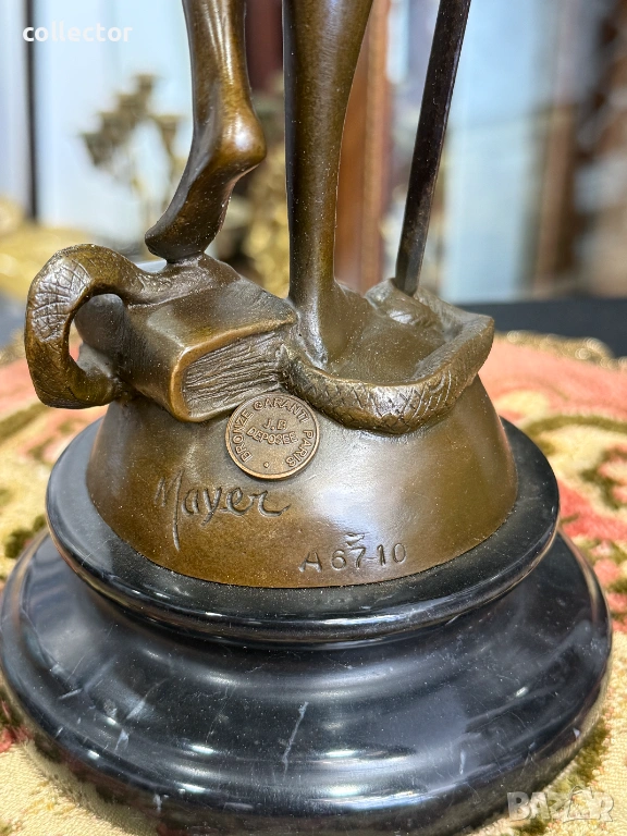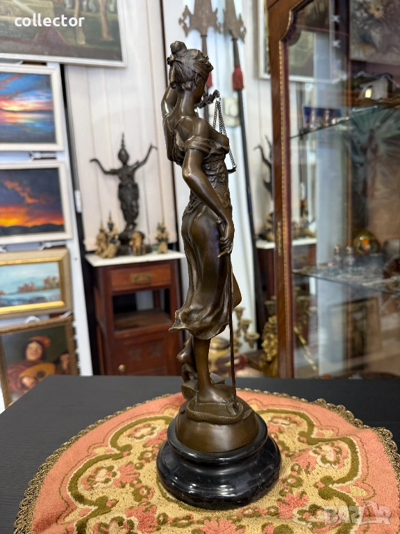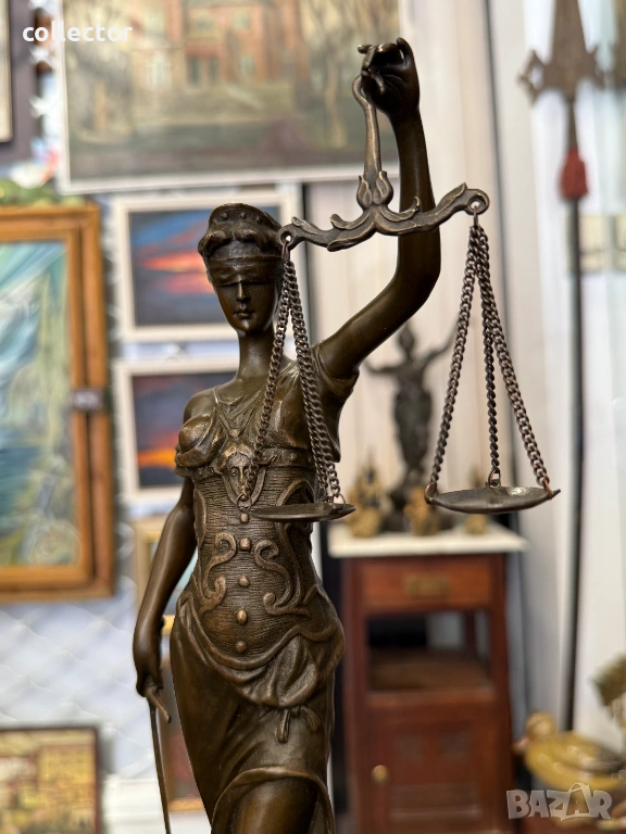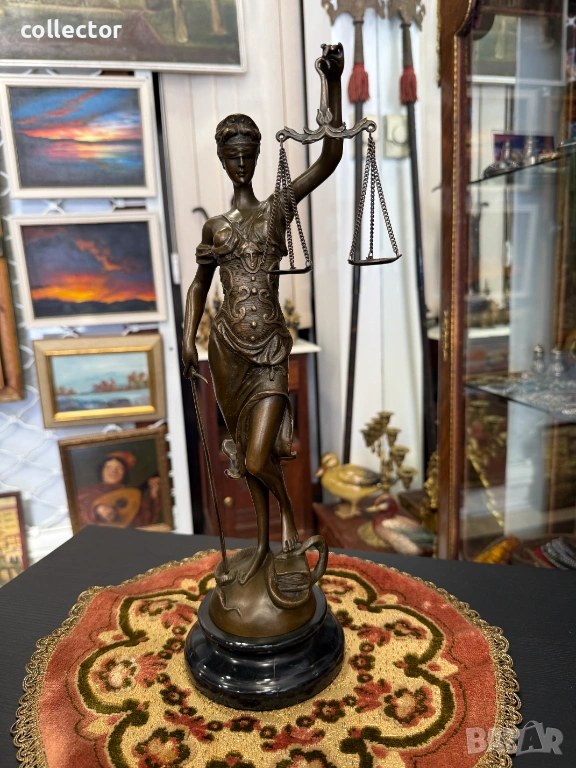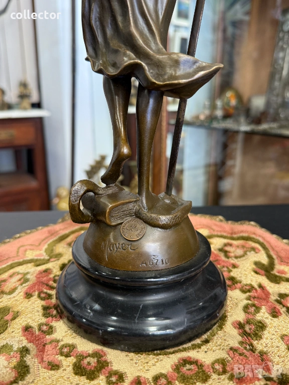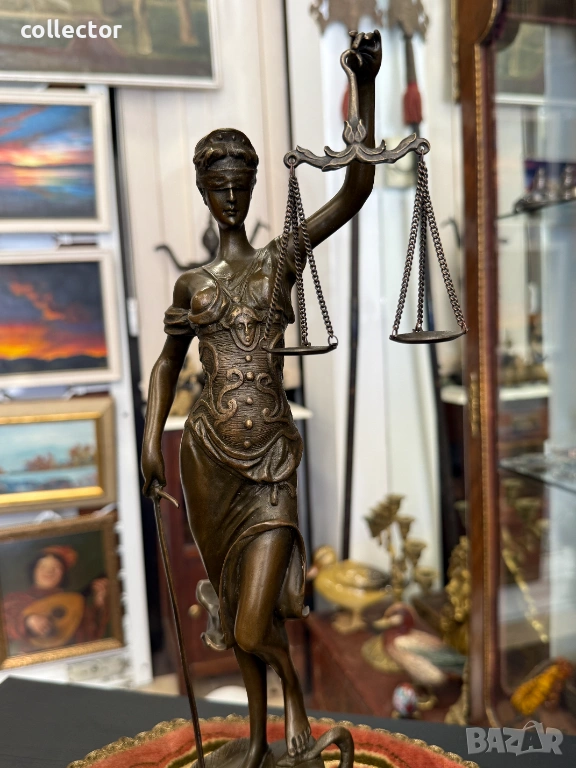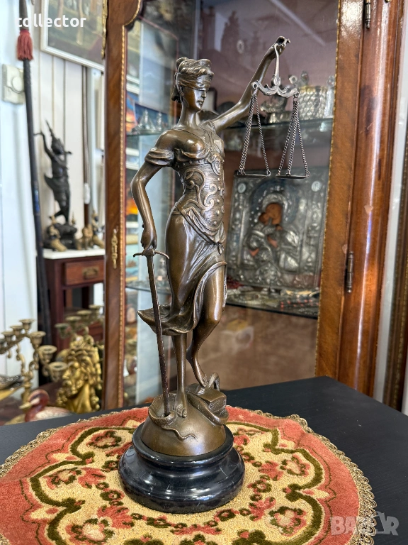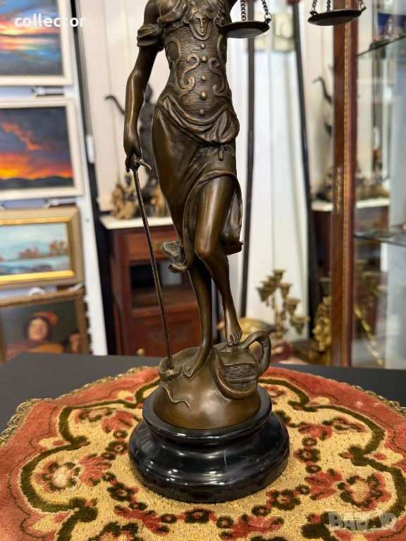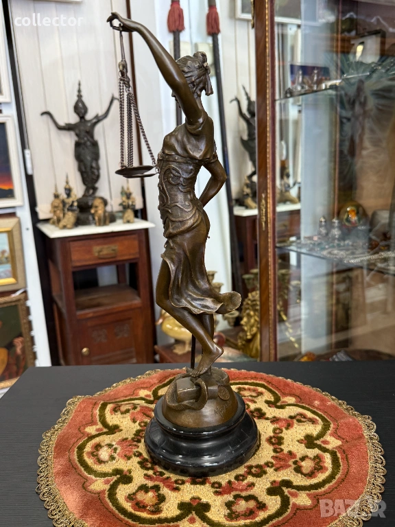 Бронзова скулптура на - "Mayer", лята в Париж с маркировка за качество. Същата изобразява Темида (известна още като Лейди Юстиция) — древногръцката богиня на правосъдието, божествения ред и закона.