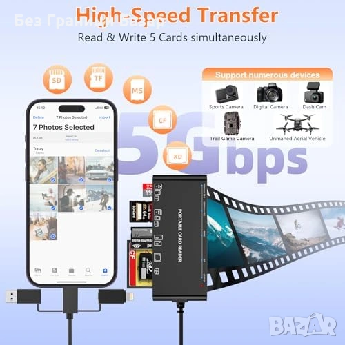Нов Адаптер четец за карти 7 в 1 за SD/TF/CF/MS/xD USB-C Lightning 5Gbps