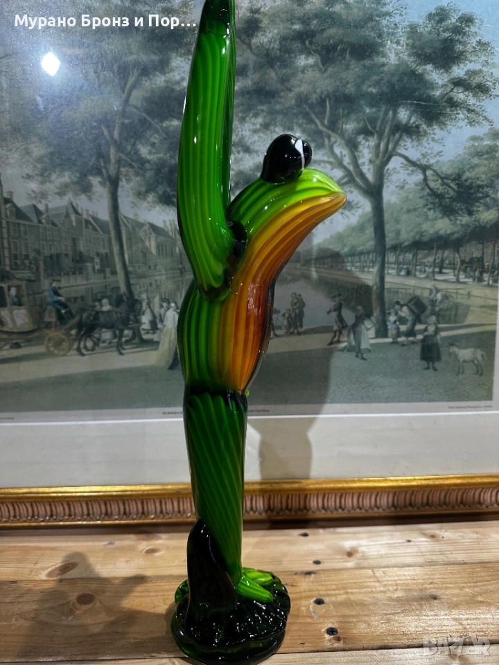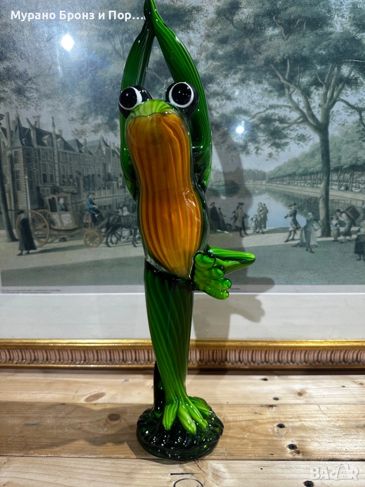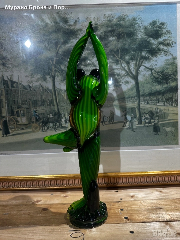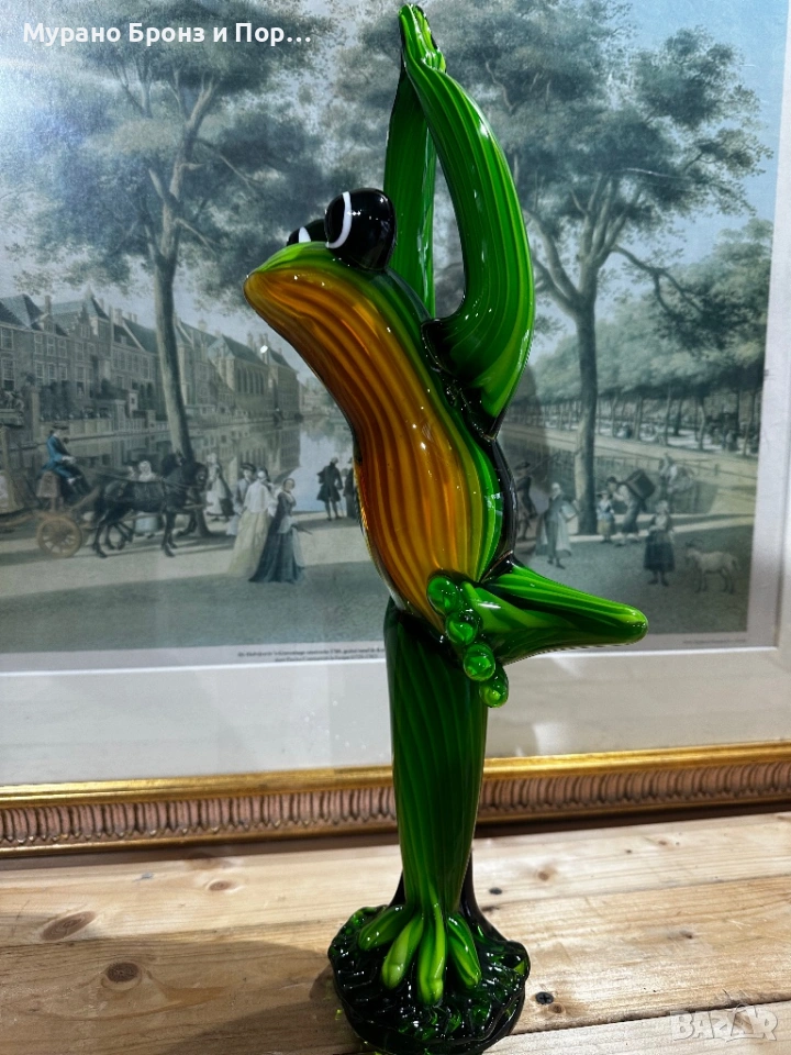 Продавам уникална, голяма фигура на жаба в йога поза, изработена от масивно, многослойно стъкло в стил Мурано. Това е впечатляващ арт обект, подходящ за висок клас декорация или специален подарък. Фигурата се отличава с наситени цветове, специфично оребряване и голяма детайлност.