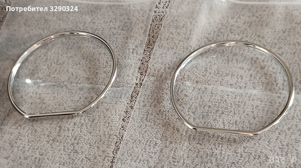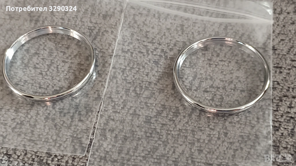 Последен комплект са ! Бяха 3 ...този се оказа съм много лек производствен дефект във долният ръб на лявата част на всеки от големите рингове! Снимал съм ги ! Останалото в перфектно ! 15 евро ! Предните бяха по 20 ! На единият е много лека забележката спрямо другият! Вижда се ! Хромирана пластмаса !