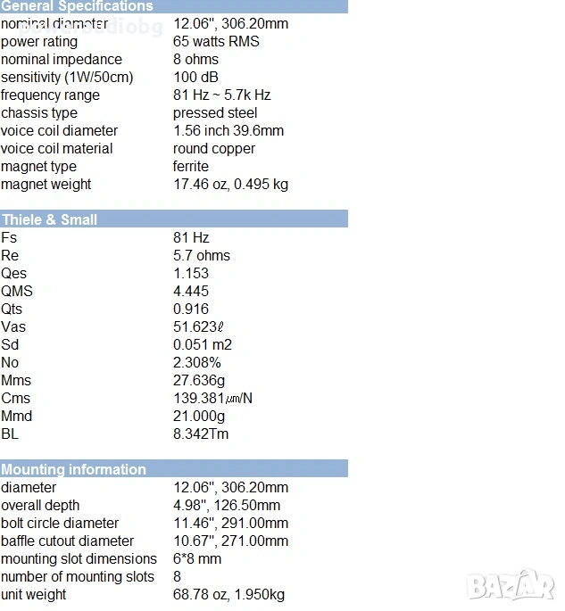 Американски Профи 12 инча говорител Marshall 300RFL10 - 65W/130W - 8 OHM - 1бр.