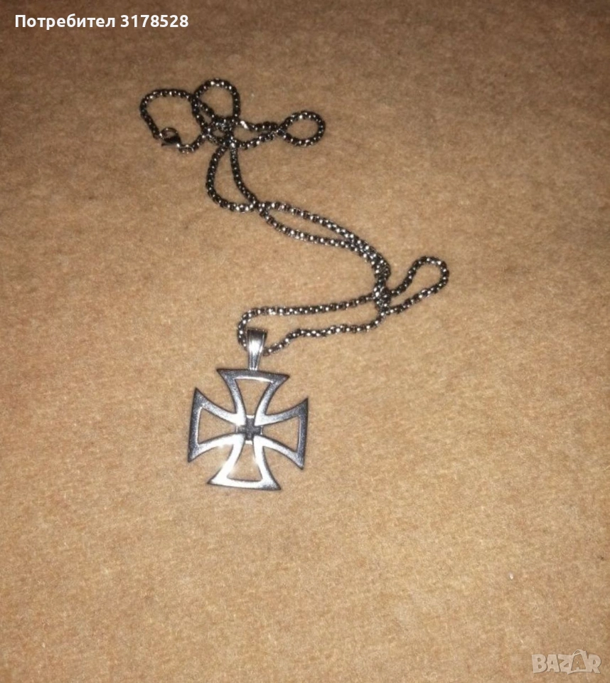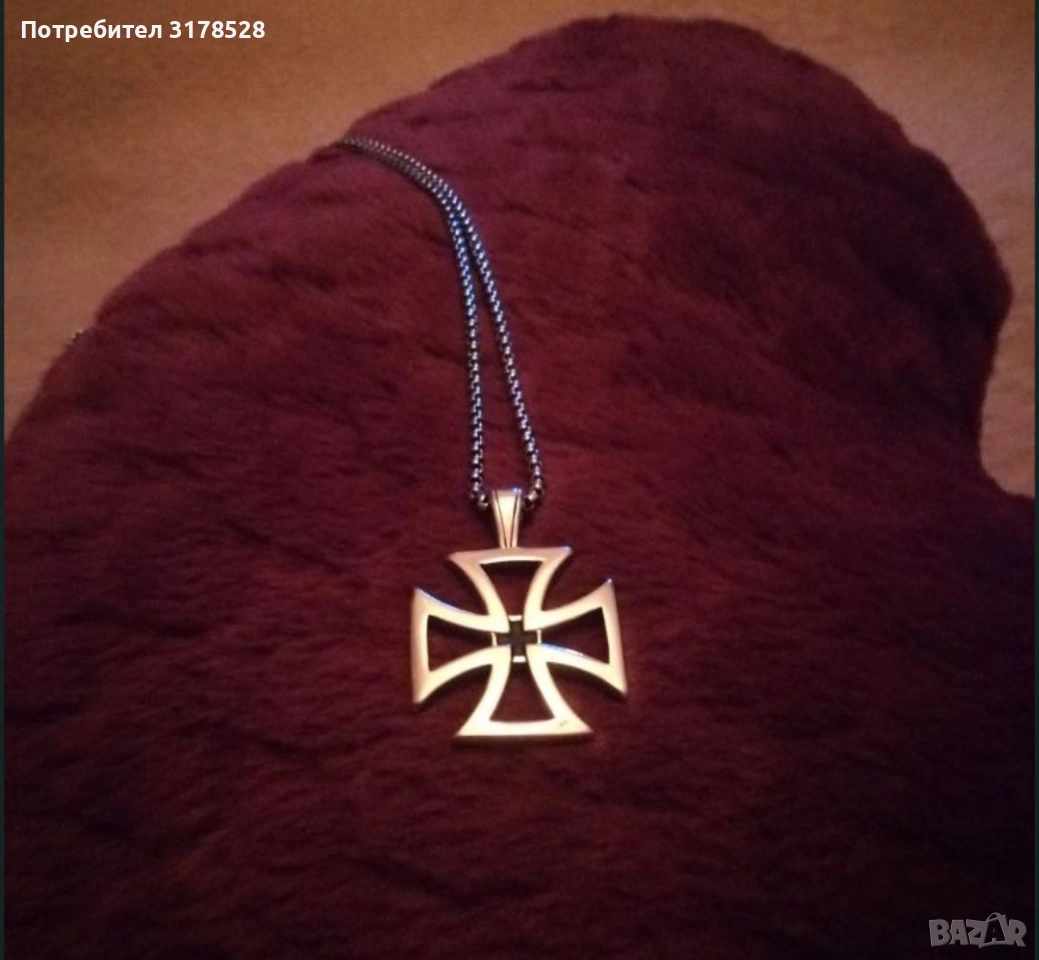 Тамплиерски кръст от неръждаема висококачествена стомана. Не променя цвета си и не се драска,може да се мие с всякакви препарати до блясък включително и обезмаслител стоманата наистина е на ниво. С голям със дебел ланец 60 см дължина. Кръста е масивен с размери 3,5 на 3,5 см. С кутия подходящ за подарък.