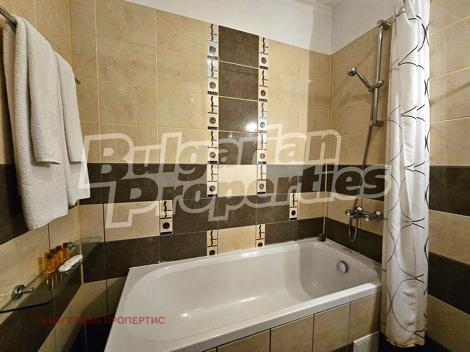 Баня с тоалетна: вана, мивка с огледало и тоалетна;