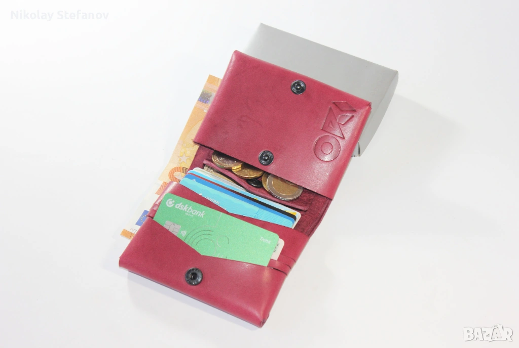 - Разполага с 3 слота за карти, които побират общо 6 карти, отделение за банкноти, голям монетник и 1 допълнително отделение за още карти и визитки