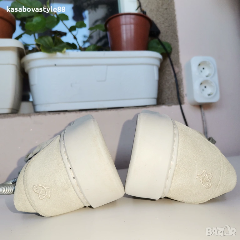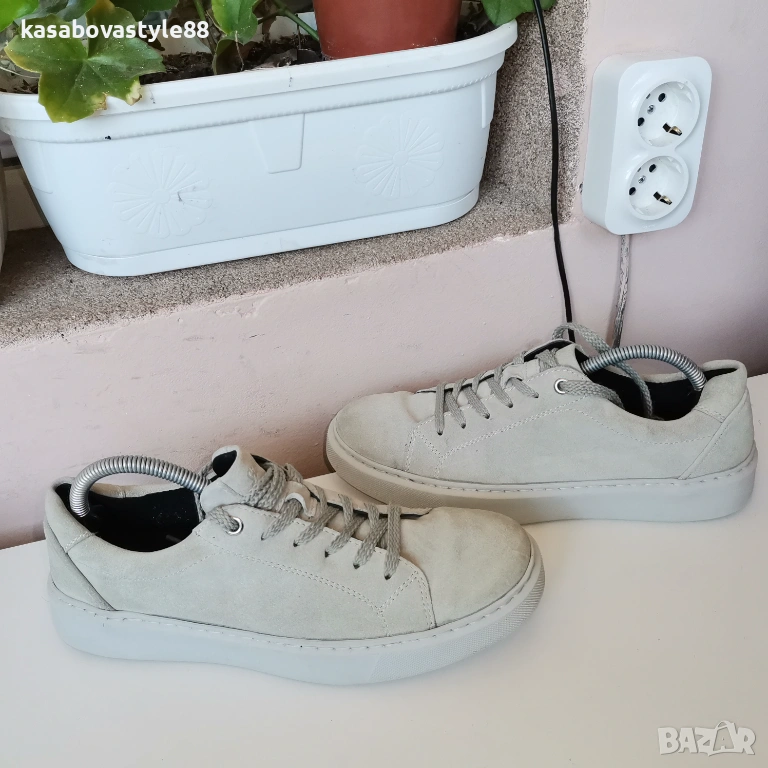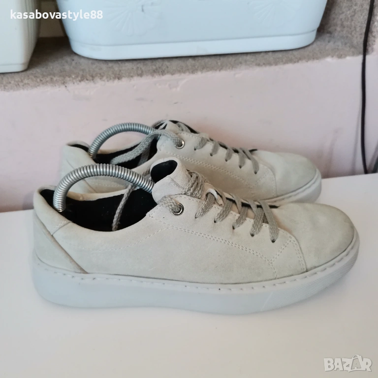 Дамски спортни обувки в светло - бежов цвят, изработени от естествен велур и естествена кожа отвътре в комбинация с текстил. Те са надеждни,олекотени и с комфортно гъвкаво ходило, което е фабрично шито за повече здравина. Стелката е мека и вадеща при нужда. Дължина на стелка 24.5см.Цялостна височина отзад 8см.