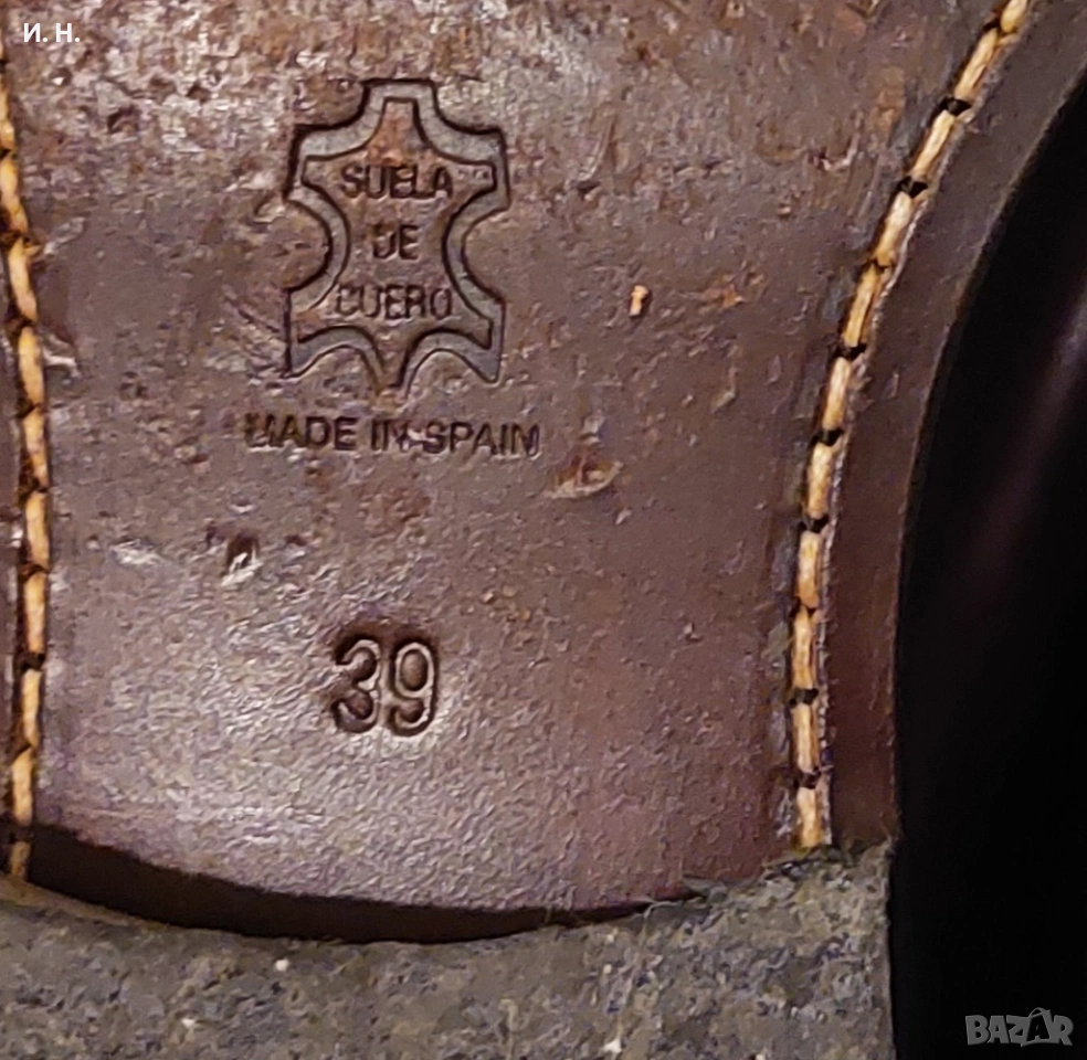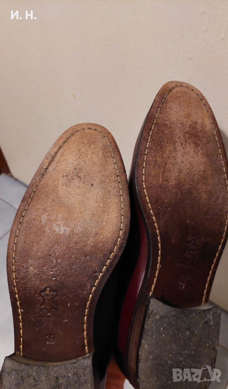 Сега за размера, поради който ги продавам. Според тях 39 трябваше да ми стане на 25 см. десен крак и 25.5 см. ляв. Ами не стана. На дясното стъпало се ядва, макар да е неприятно, но на лявото не се търпи след час носене. Експерти казват, че кожените официални обувки имат нужда от около 24 часа (може да не са поредни), за да се "разчупят" и да станат удобни. Направих ги тези часове и не стана - просто са ми малки и това е.
