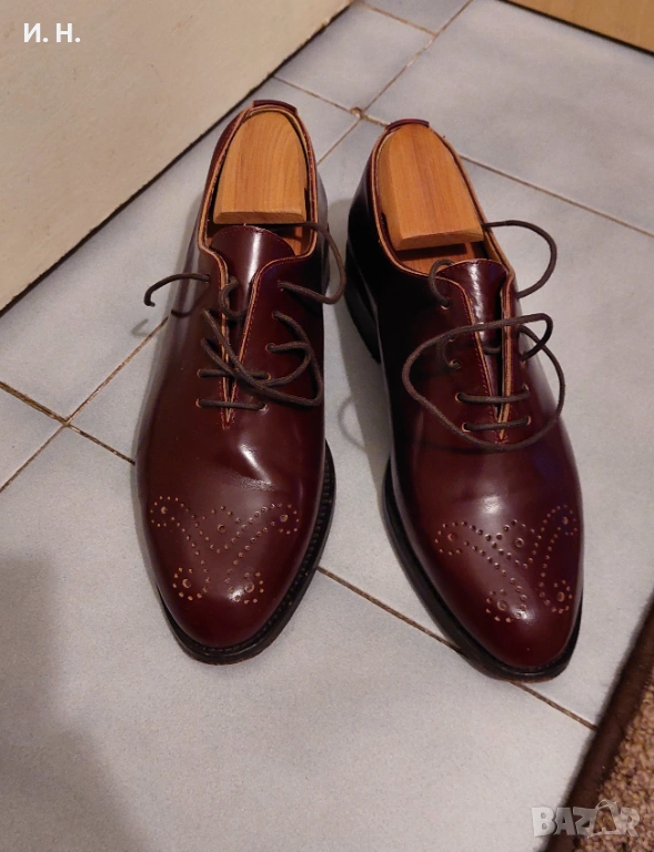 Официални обувки, изработени в Испания от "Хокърти" в бургундско червено. Класически оксфордски модел със затворено връзване и цяло парче кожа (не от две или три като при "cap toe" варианта). Гьонена подметка, зашита за останалата конструкция с "Blake stitch".