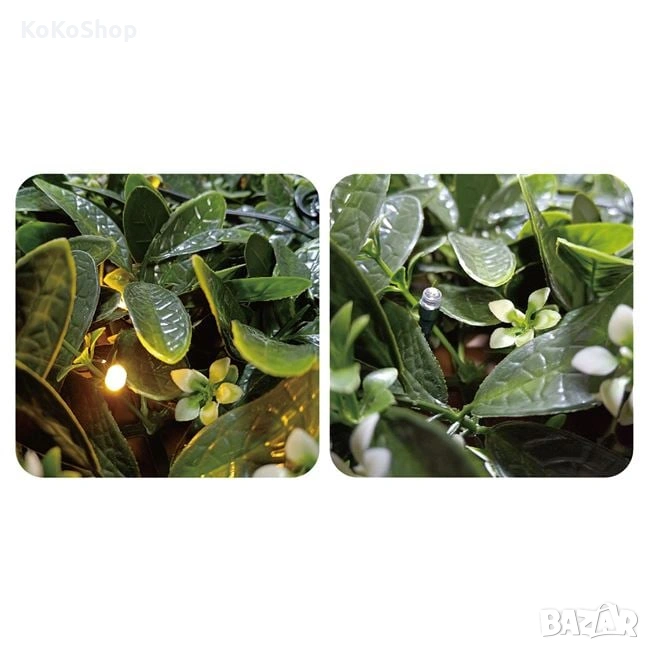 Пано със зеленина, нежни бели цветя и Led светлини. Светлинната верига е с 22 броя лампички,които светят в топла бяла светлина,в два режима. Захранването е със соларен панел, който е с кабел с дължина 3 метра.