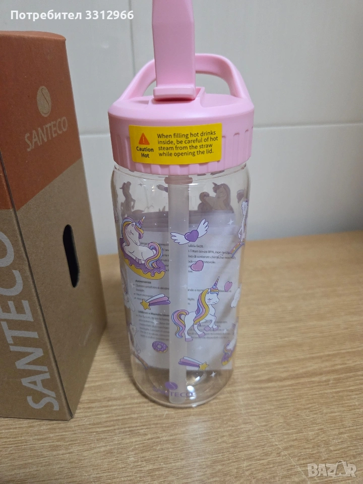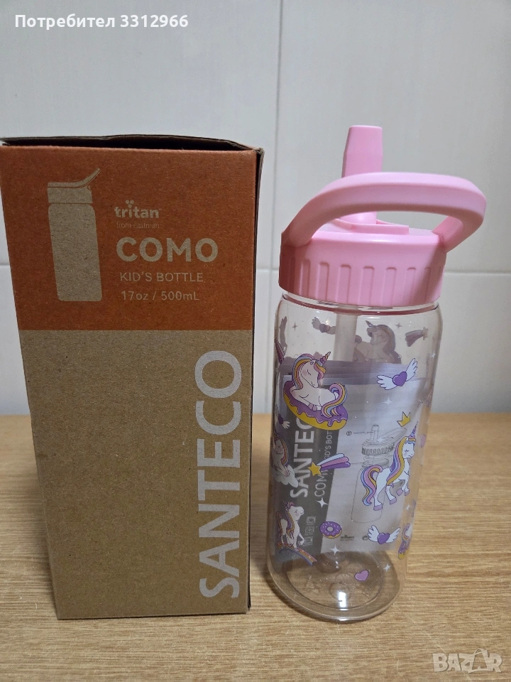 Чисто нова детска бутилка за вода Santeco COMO Kids Bottle с вместимост от 500 мл (17 oz). Материал: Изработена от Tritan, материал без съдържание на BPA, който е здрав и прозрачен. Дизайн: Бутилката е с розов капак и мотиви с еднорози.
