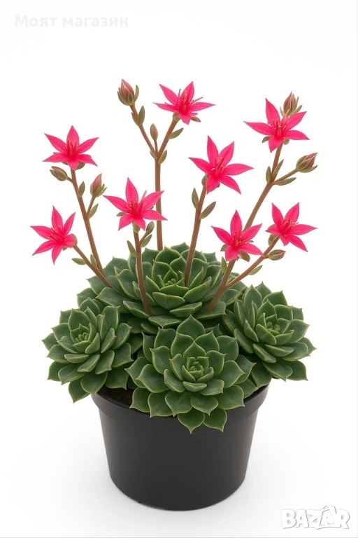 Ешеверия „Испанска звезда“ – сукулент с яркорозови цветове Цена 4.99 € Ешеверията, известна още като „испанска звезда“, е впечатляващ сукулент с плътни зелени розетки и ярки, звездовидни розови цветове. Тя е идеален избор за всеки дом, офис или тераса благодаря на лесната поддръжка и декоративната си стойност. Характеристики: Вид: Echeveria Популярно име: Испанска звезда Цвят: ярко розов Листа: месести, подредени в компактни розетки Светлина: ярка, разсеяна Поливане: веднъж на 10–14 дни, при напълно суха почва Размер: 10–15 см Предимства: Много ефектен цъфтеж Подходящ за начинаещи Идеален декоративен акцент Перфектен подарък Растенията са в контейнери, което позволява засаждането им да се извършва почти целогодишно. Много от растенията променят вида си през периодите на своята вегетация, но тук в сайта със снимки се представят в най-атрактивния им вид. Повечето снимки в сайта ни покзват как ще изглеждат растенията след определен период и положени необходимите грижи. Моля разгледайте и другите ни растения в сайта. Благодарим че избрахте нас 😊 Тел. 0877977519
