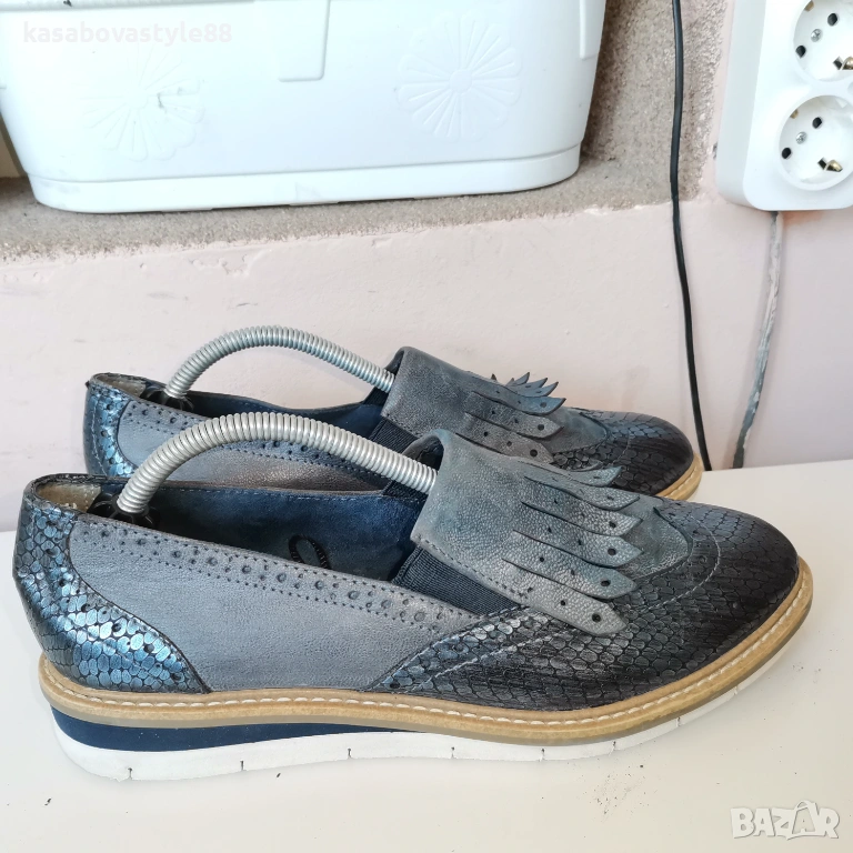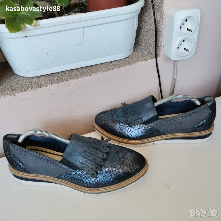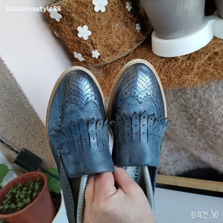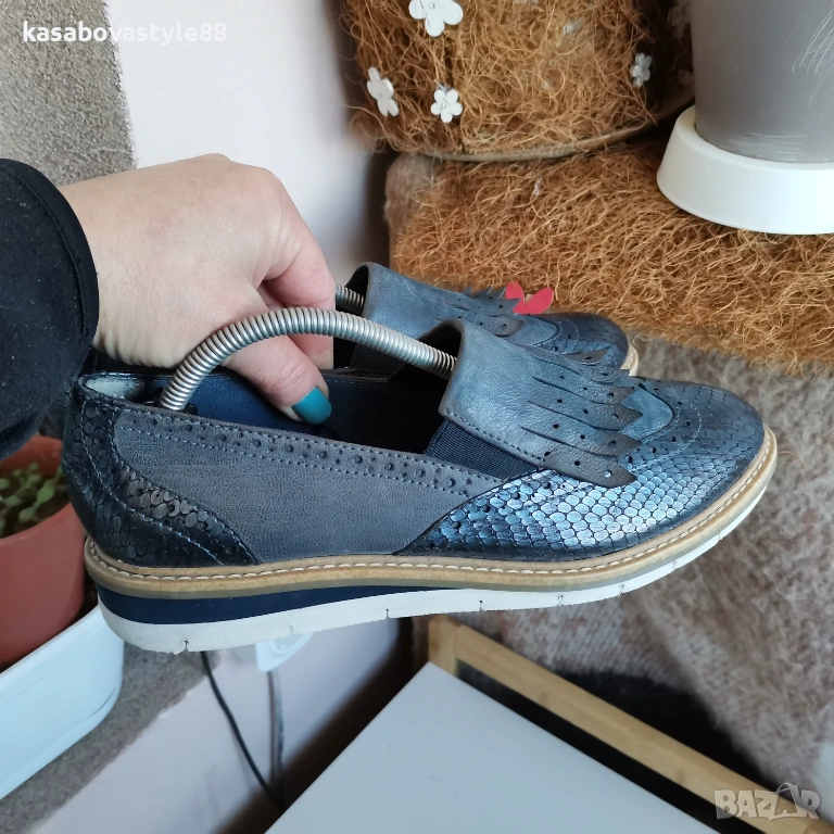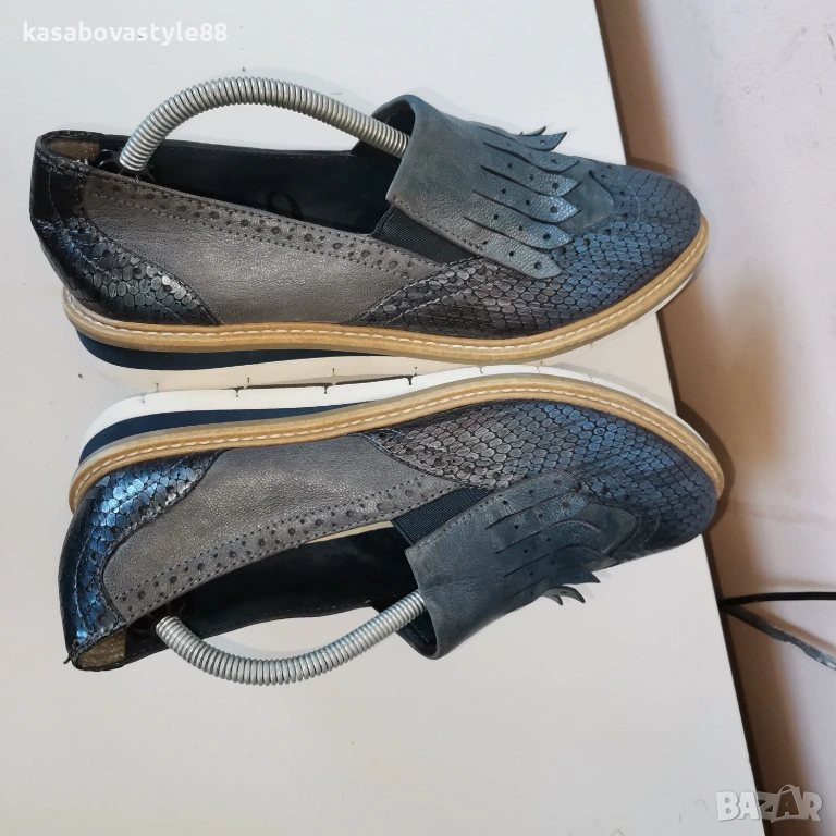 Актуален модел стилни обувки от естествена кожа в синьо-блестящ цвят с ресни и ефектна щампа. . Перфектно състояние, без забележки. !! Отвътре са с мек антибактетиален хастар и комфортна кожена стелка от естествена кожа . Подходящи както за официални поводи, така и за ежедневието. Дължина на стелка 24. 8см.Ходило 2.5см.Цялостна височина отзад 9см.