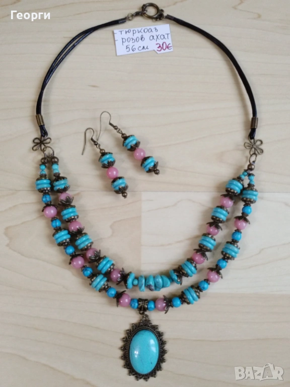 Красиво и нежно дамско колие с естествени камъни в свежа комбинация от тюркоазено синьо и розов ахат. Бижуто е ръчно изработено и завършва с ефектна висулка в бохо стил. Комплектът включва и подходящи обеци.