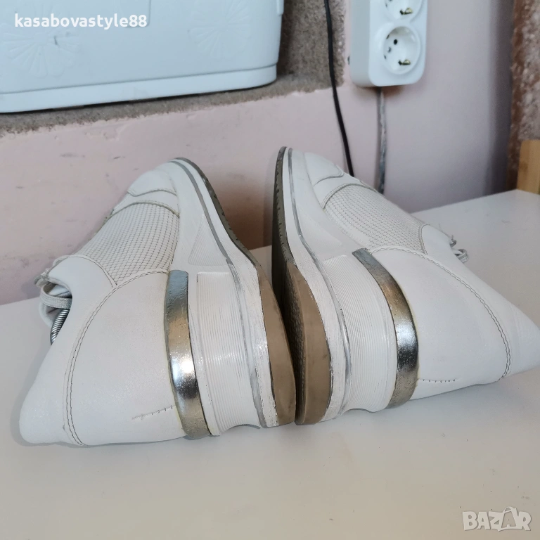 Актуален модел спортни обувки в бял цвят със сребристи елементи и ефектна щампа, направени от естествена кожа и текстил отвътре. В отлично състояние!! Разполагат с практични функциониращи ципове,както и връзки, улеснявайки обуването.Стелката е мека и комфортна и при нужда може да се вади. Отговарят на 39.5н.Дължина на стелка 25.8см.Ходило 5см при най-високата част. Цялостна височина 12см.