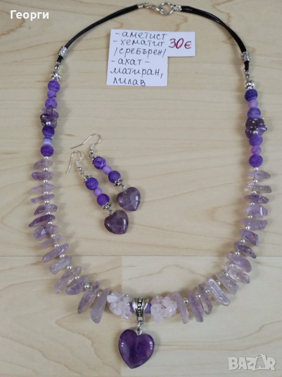 Елегантен ръчно изработен комплект бижута в нежни лилави нюанси, съчетаващ естествен аметист, хематит и матов ахат. Комплектът включва ефектно колие с висулка сърце и стилни обеци, подходящи както за ежедневието, така и за специални поводи.