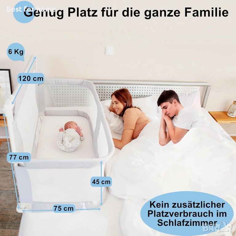 Близост и безопасност в комбинация - Нашето бебешко легло позволява на вашето бебе да спи безопасно в леглото на родителя. Така винаги го имате под око и сте веднага до него, ако е необходимо.