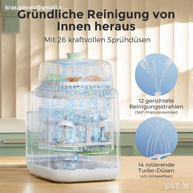 26 дюзи за високо налягане: По-щадящи от микровълнова фурна/съдомиялна машина. 12 вътрешни пръскачки + 10 ротационни дюзи от momcozy машината за почистване на шишета премахва дори засъхналите остатъци от мляко безопасно и нежно - без риск от повреда. Максимална хигиена с минимални усилия.