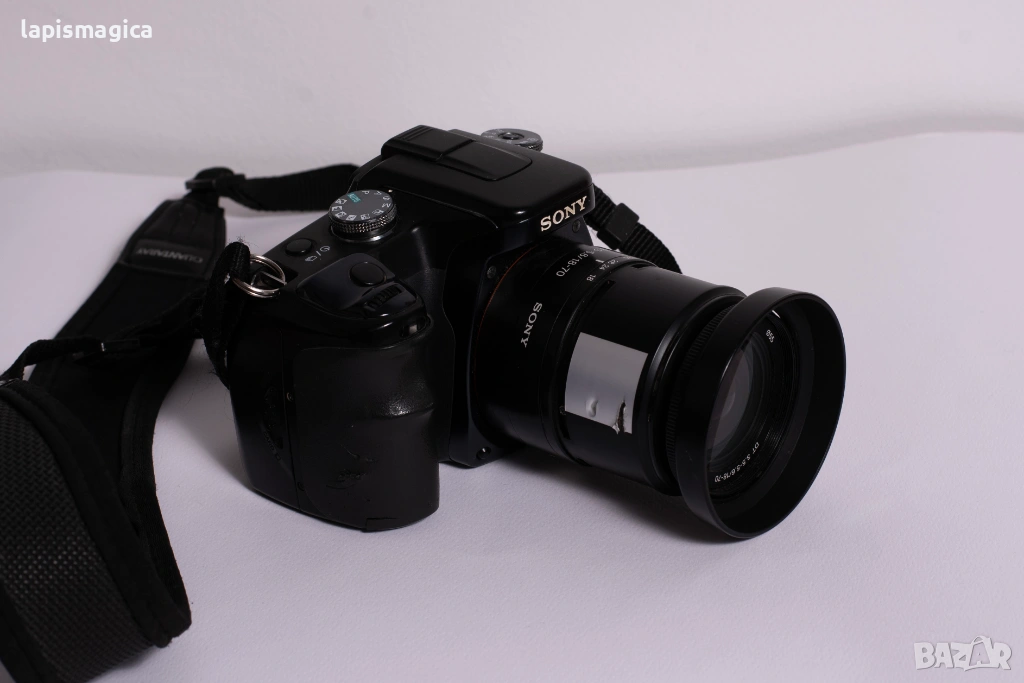 Продавам Sony A100 с обектив 18-70mm от името на роднина. Визуално е с козметична забележка след инцидент с любопитно куче. Следите от зъби се виждат - гумата на обектива липсва, и част от гумите на тялото имат следи от зъби.