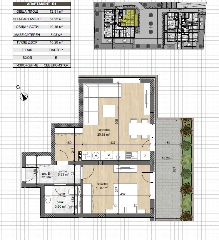 АПАРТАМЕНТ Б1 е с жилищна застроена площ от 57.92кв.м. които са функционално разпределени между всекидневна с кухненски бокс с площ от 25.92 кв.м. и спалня - 13.87кв.м. Във входното антре е предвидено място за гардероб и съхранение на вещи, баня с тоалетна и веранда с двор. Към апартамента има включено мазе в сутерена.
